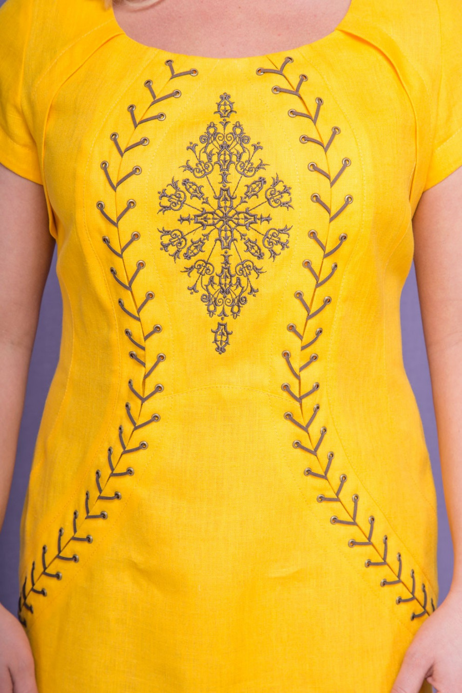 Платье женское ArtRibbon, полуприлегающего силуэта из льняной ткани. По центру переда выполнена декоративная вышивка. Перед платья с фигурными рельефами и подрезами, по подрезам металлические блочки со шнуровкой. Спинка с талевыми вытачками и средним швом, который заканчивается функциональной шлицей, в верхней части среднего шва обработана застежка на потайную тесьму "молния". Рукава втачные, короткие.