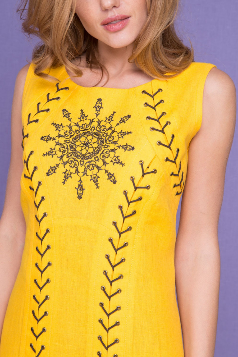 Платье женское Art ribbon, полуприлегающего силуэта из льняной ткани, слегка расширенное к низу. По переду обработаны фигурные подрезы с блочками и шнуровкой. По центру переда декоративная вышивка. По спинке талевые вытачки и средний шов, в верхней части которого обработана застежка на потайную тесьму "молния". По низу платья горизонтальная отрезная деталь. Горловина обработана обтачками. Проймы окантованы.