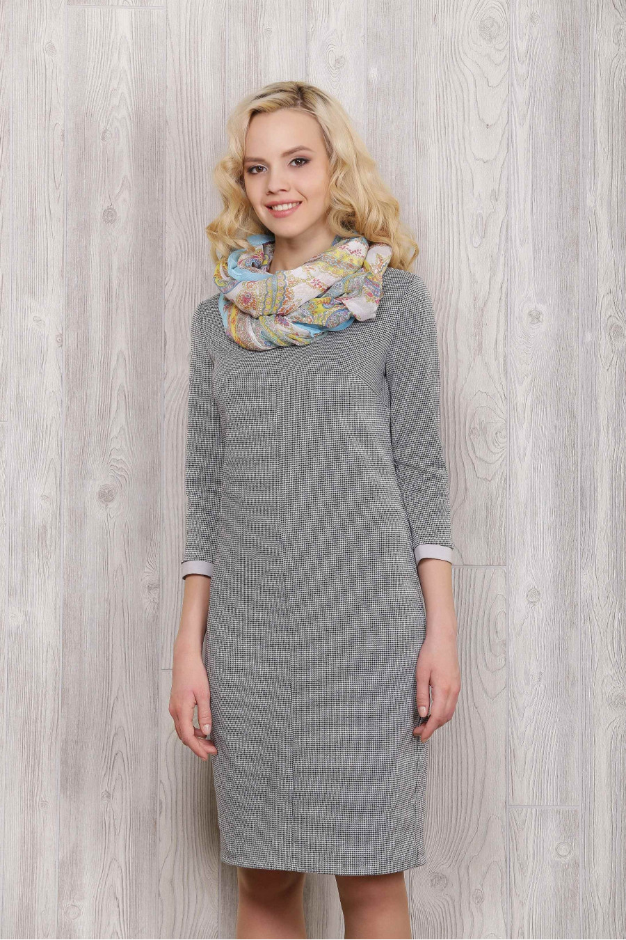 Платье в классическом стиле с однообразным рисунком, позволит вам посещать деловые мероприятия, а рукава в три четверти не будут сковывать ваших движений. Шарф в комплект не входит.