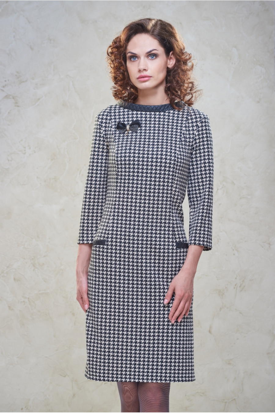 Шикарное платье с модным принтом "гусиные лапки" сделает ее обладательницу настоящей леди. Брошь в комплект не входит.