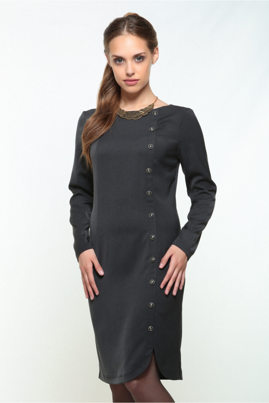 Платье классической длины с принтом в виде пуговиц сбоку, что придает игривости деловому образу