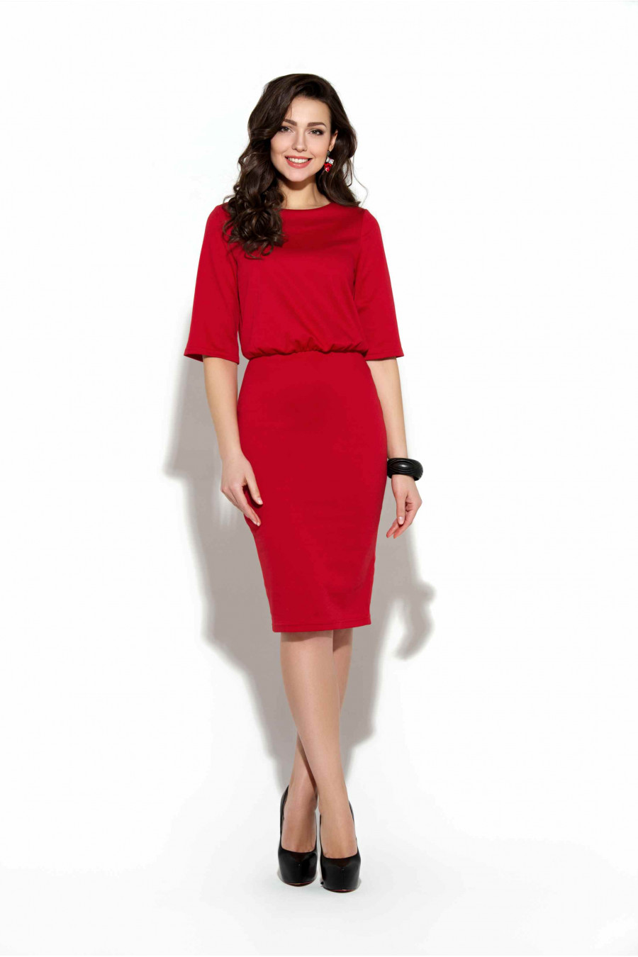 Элегантное платье с объемным верхом из практичного трикотажа «лакоста». Платье отрезное по линии талии, с драпировками на полочке и спинке. В шов на линии талии вшита резинка, благодаря которой платье хорошо фиксируется. Лиф платья образует небольшой навал, что позволяет посадить платье на любую фигуру. Юбка формы «карандаш». Рукав до линии локтя слегка расширен к низу. В среднем шве спинки застежка на потайную молнию и шлица. Вырез горловины – «лодочка».