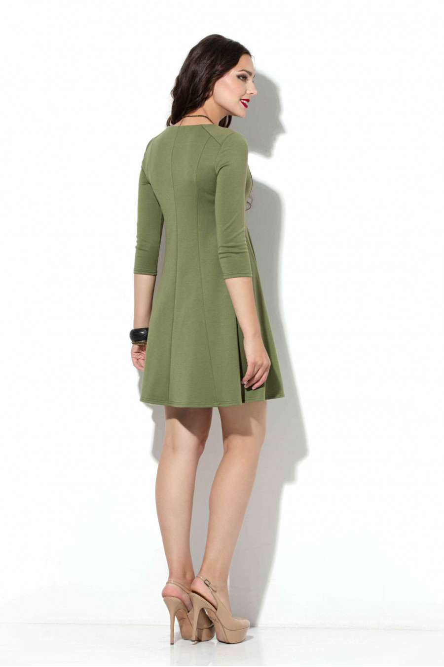 Коктейльное платье длиной мини. Платье клешеное от груди выполнено из трикотажа «джерси». Силуэт платья достигнут благодаря рельефам и боковым швам. Рукав втачной 3/4. Вырез горловины глубокий V-образый. На лифе платья введены декоративные кокетки. Завышенная линия талии позволяет скрыть некоторые недостатки фигуры и визуально удлиняет ноги. Длина – 83-85 см (зависит от размера).
