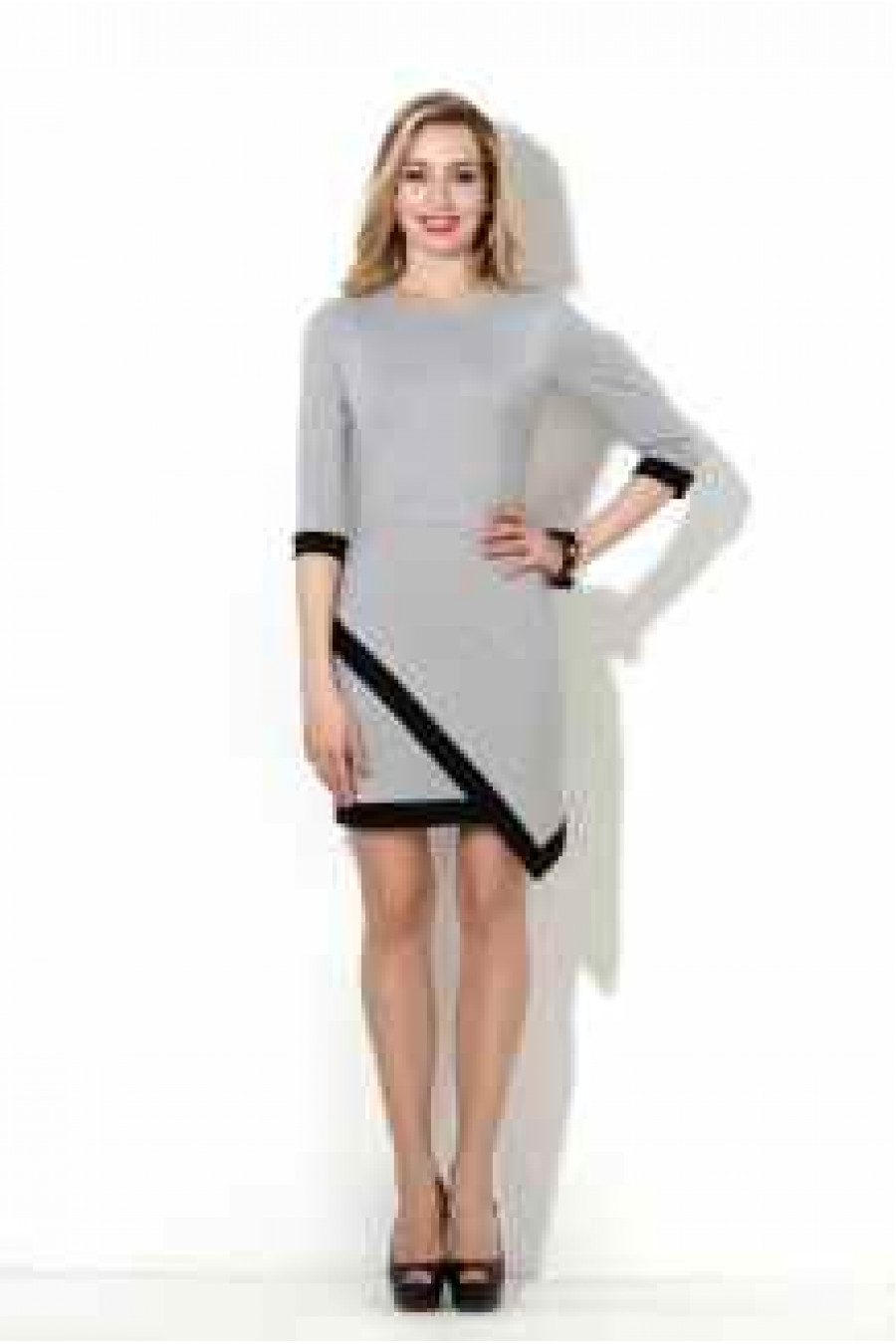 Коктейльное платье из джерси с асимметричной юбкой. Платье отрезное по линии талии, на полочке и спинке рельефы, благодаря которым достигается идеальная посадка изделия по фигуре, в среднем шве спинки молния. Вырез горловины неглубокий круглый. Рукав втачной 3/4 с манжетом. Юбка длины мини, двухслойная. Верхняя юбка имеет асимметричный крой, из под нее видна классическая мини-юбка. Этот элемент придает модели оригинальность и модную актуальность. Декоративная планка на верхней юбке, а так же манжеты на рукавах выполнены из ткани контрастного цвета. Длина – 83-85 см (зависит от размера).