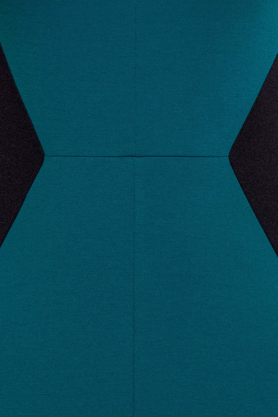 Платье прилегающего силуэта из джерси. Силуэт модели, достигнут благодаря талиевым выточкам на спинке и необычным фигурным боковым швам. Вырез горловины круглый не глубокий. На полочке вертикальный и горизонтальный декоративные швы. Юбка заужена к низу, форма – «карандаш». Платье выполнено из двух контрастных цветов ткани. Модель платья визуально стройнит фигуру, подчеркивая линию талии, а линия бокового шва выглядит эффектно и модно.