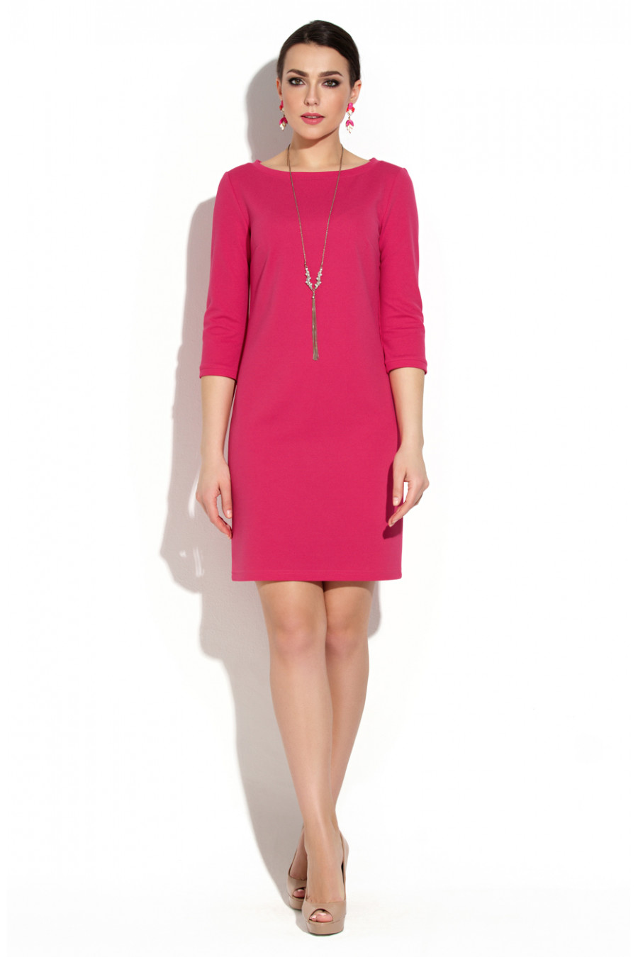 Коктейльное платье полуприлегающего силуэта. Данная модель выполнена из трикотажа – «диор». На полочке нагрудные вытачки, что обеспечивает отличную посадку платья. Вырез горловины не глубокий – «лодочка». Рукав – ¾, втачной. Горловина и низ рукава обработаны декоративными деталями.