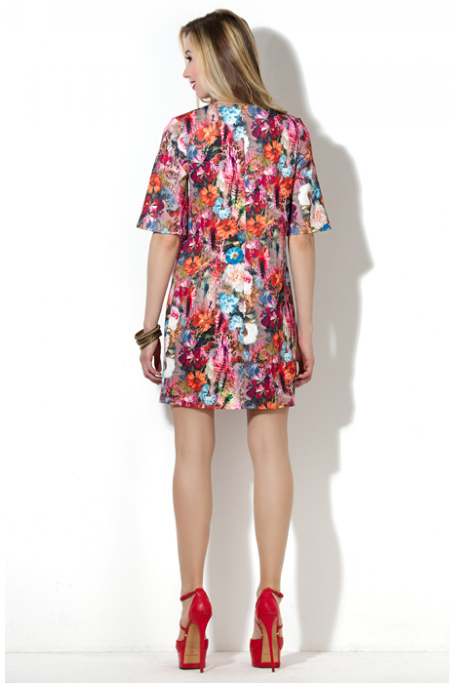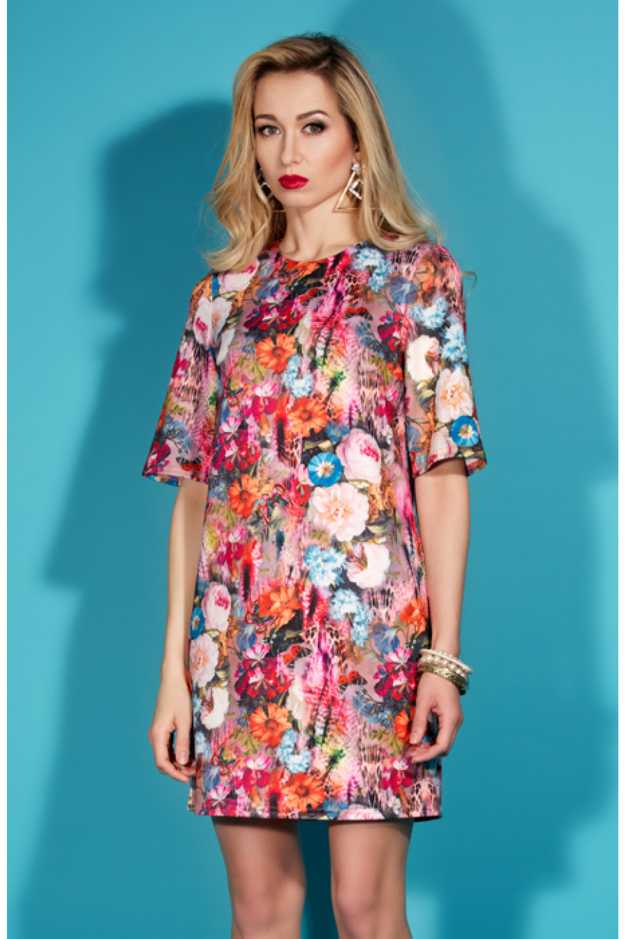 Прямое платье из принтованного трикотажа «водолаз». Платье простого кроя, на полочке вытачки, на спинке средний шов. Вырез горловины круглый. Модную актуальность платью придают широкие втачные рукава длиной до локтя. Прямой, свободный силуэт платья подходит обладательницам всех типов фигур, а последние несколько сезонов он еще является и модным трендом. Сочетание прямого силуэта с цветочным принтом делает данную модель ультрамодной и современной. Длина – 81-83 см (зависит от размера).