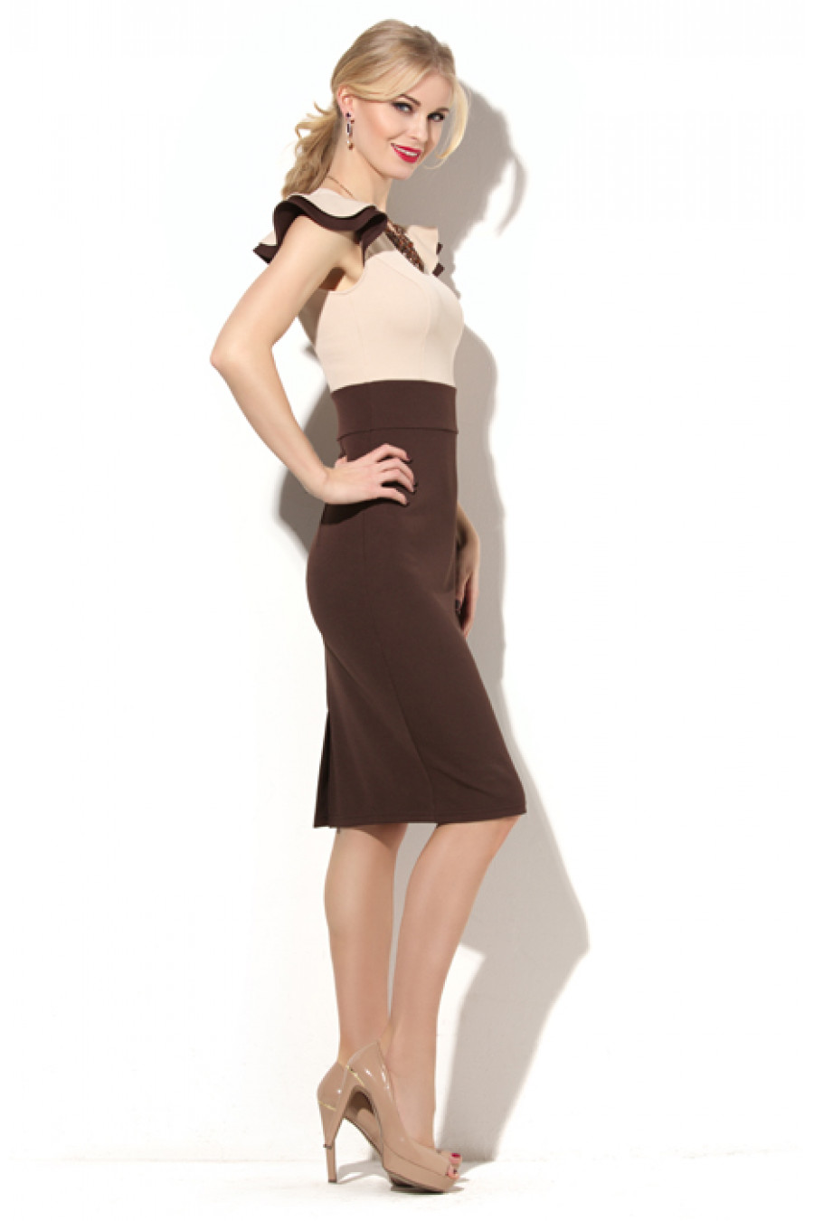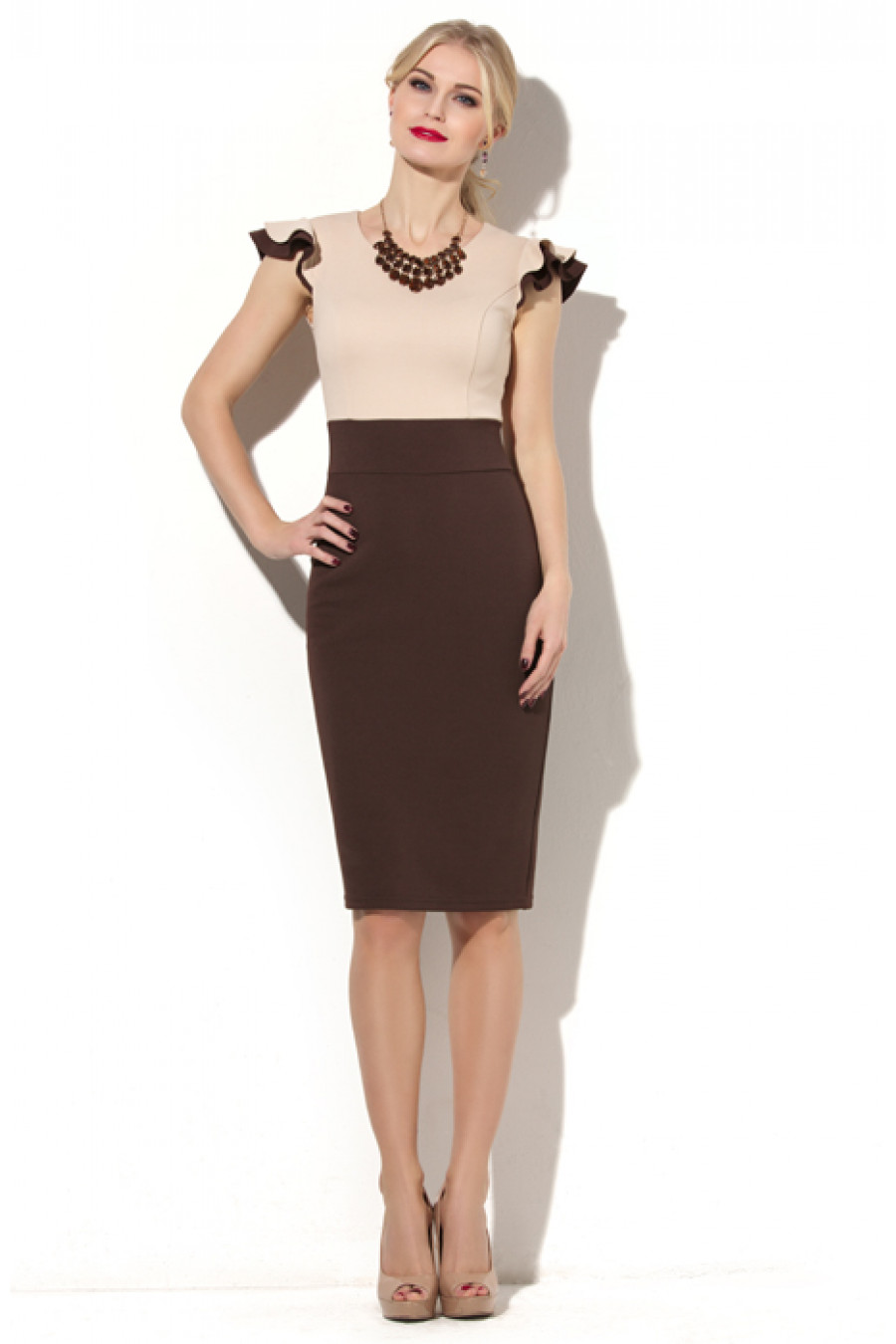Элегантное платье полуприлегающего силуэта. Данная модель выполнена материла – «диор», это плотное трикотажное полотно на первый взгляд очень похоже на костюмную ткань. На полочке и спинке лифа введены рельефы, эти конструктивные линии, а так же боковые швы, создают силуэт модели. На спинке в среднем шве застежка на потайную молнию и шлица. Длина – 97-100 см (зависит от размера).