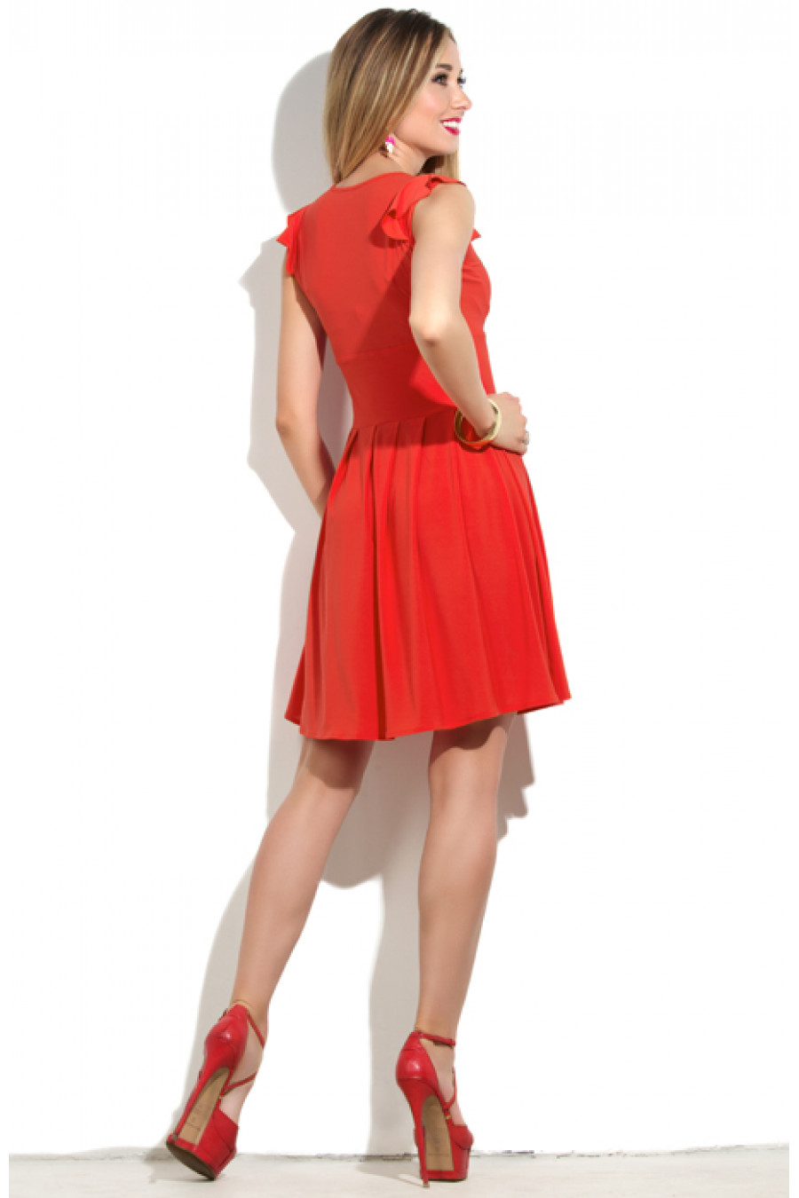 Коктельное платье из трикотажа. Платье отрезное под грудью с широким поясом, подчеркивающим талию, данный элемент делает фигуру стройнее и грациознее. На лифе платья запах и драпировка. Воланы вместо рукавов напоминают крылышки, этот элемент придает модели женственности и романтизма. Юбка в складку. Длина – 87-90 см ( зависит от размера).