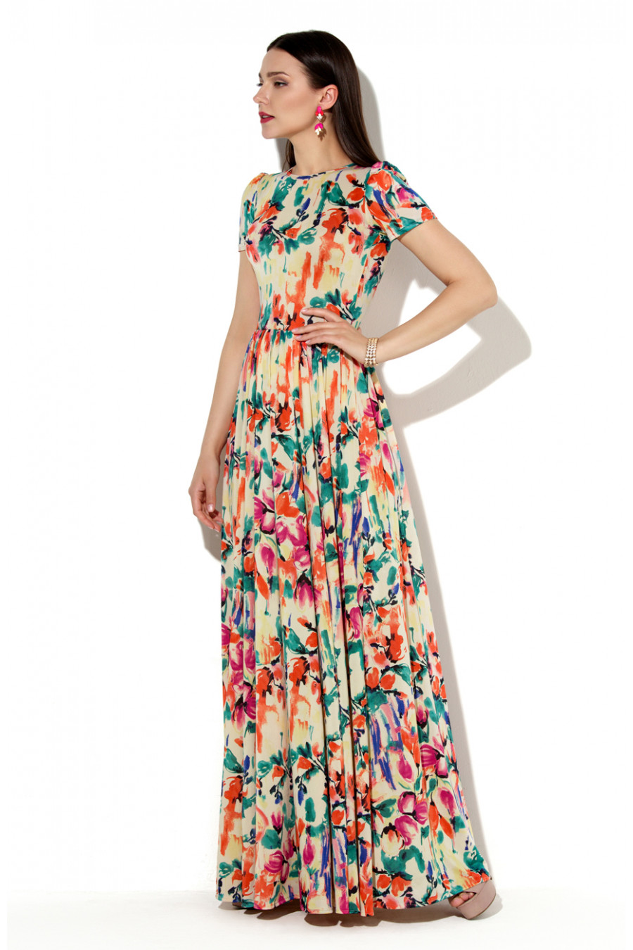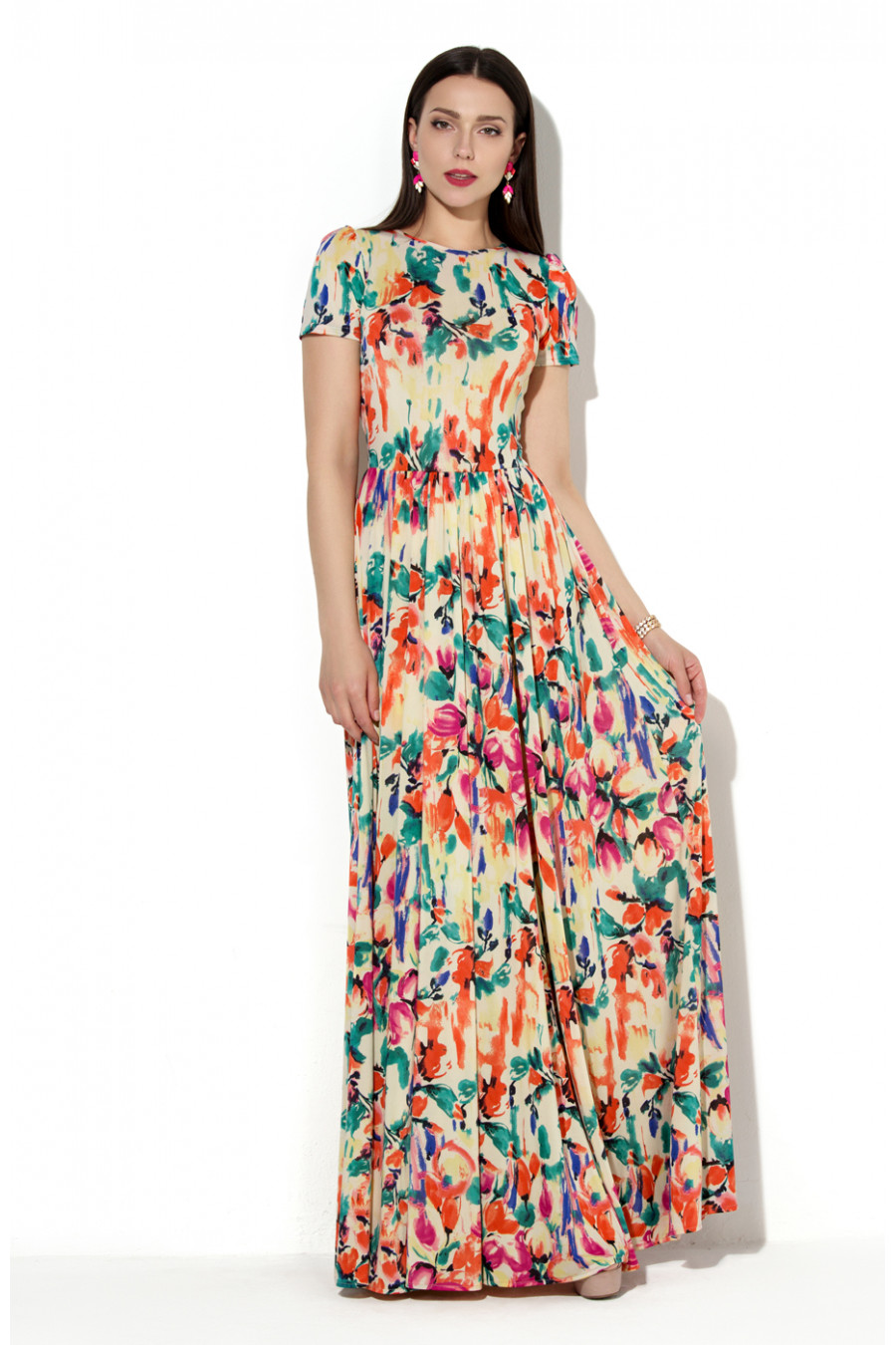 Платье в пол из принтованного трикотажа «масло». Платье отрезное по линии талии. Длинная юбка имеет сильное расклешение к низу, на линии талии густо присборена, благодаря такому крою, юбка эффектно струиться при ходьбе, что придает сексуальности и загадочности. Горловина, а так же декоративный вырез на спинке обработаны узким кантом. Рукав втачной -фонарик.