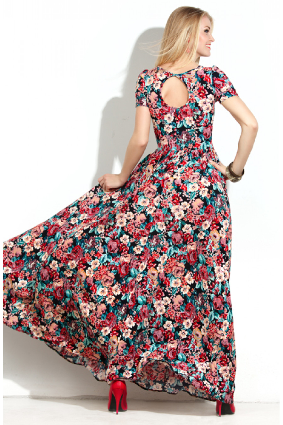 Платье в пол из принтованного трикотажа. Платье отрезное по линии талии. Длинная юбка имеет сильное расклешение к низу, на линии талии густо присборена, благодаря такому крою, юбка эффектно струиться при ходьбе, что придает сексуальности и загадочности. Горловина, а так же декоративный вырез на спинке обработаны узким кантом. Рукав втачной -фонарик. Длина – 146-149 см (зависит от размера).