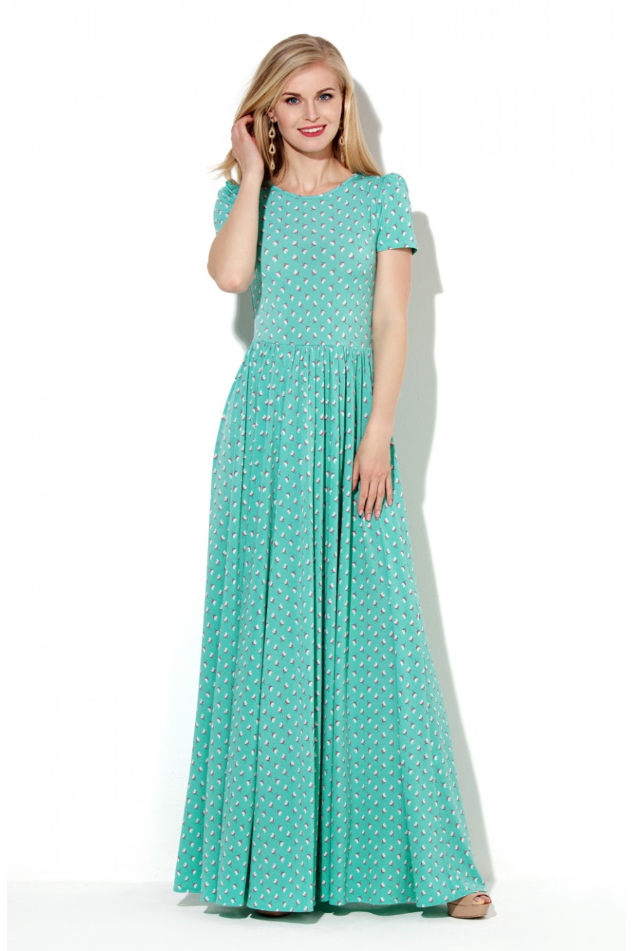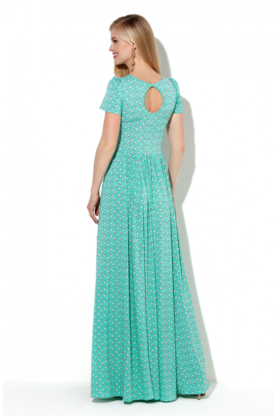 Платье в пол из принтованного трикотажа «масло». Платье отрезное по линии талии. Длинная юбка имеет сильное расклешение к низу, на линии талии густо присборена, благодаря такому крою, юбка эффектно струиться при ходьбе, что придает сексуальности и загадочности. Горловина, а так же декоративный вырез на спинке обработаны узким кантом. Рукав втачной -фонарик.