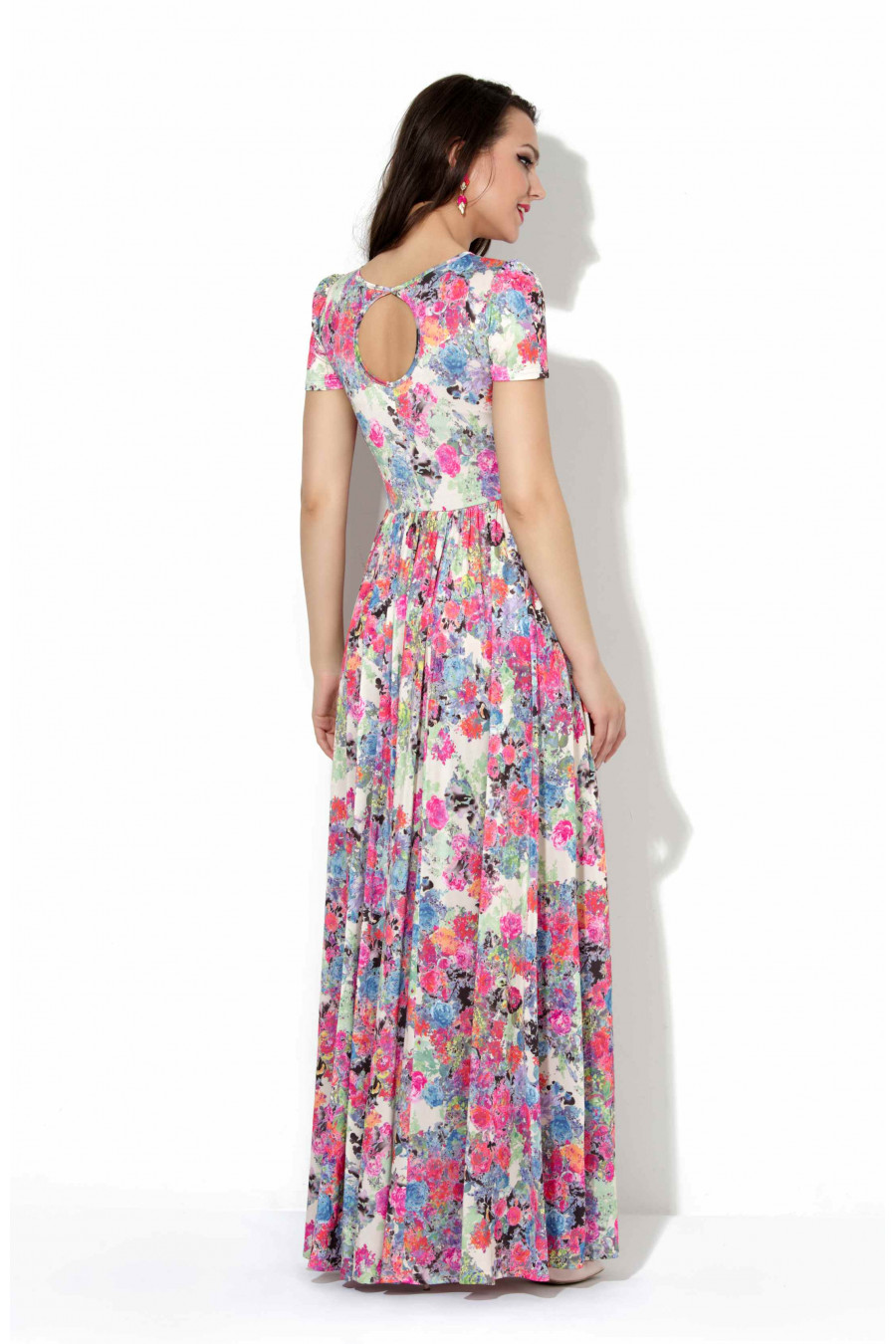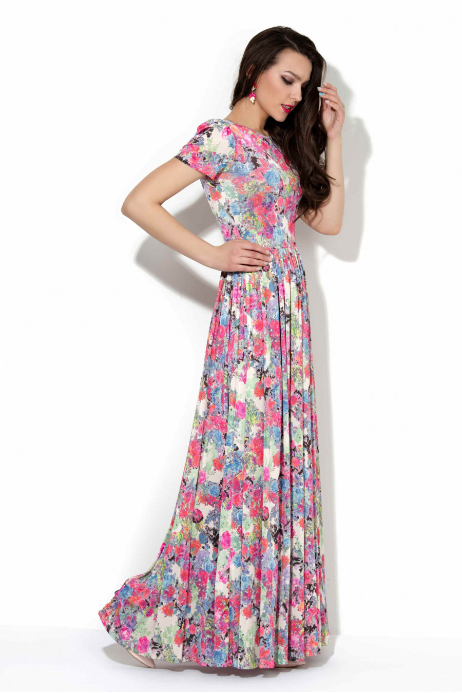 Платье в пол из принтованного трикотажа «масло». Платье отрезное по линии талии. Длинная юбка имеет сильное расклешение к низу, на линии талии густо присборена, благодаря такому крою, юбка эффектно струиться при ходьбе, что придает сексуальности и загадочности. Горловина, а так же декоративный вырез на спинке обработаны узким кантом. Рукав втачной -фонарик. Длина – 143-145 см (зависит от размера).