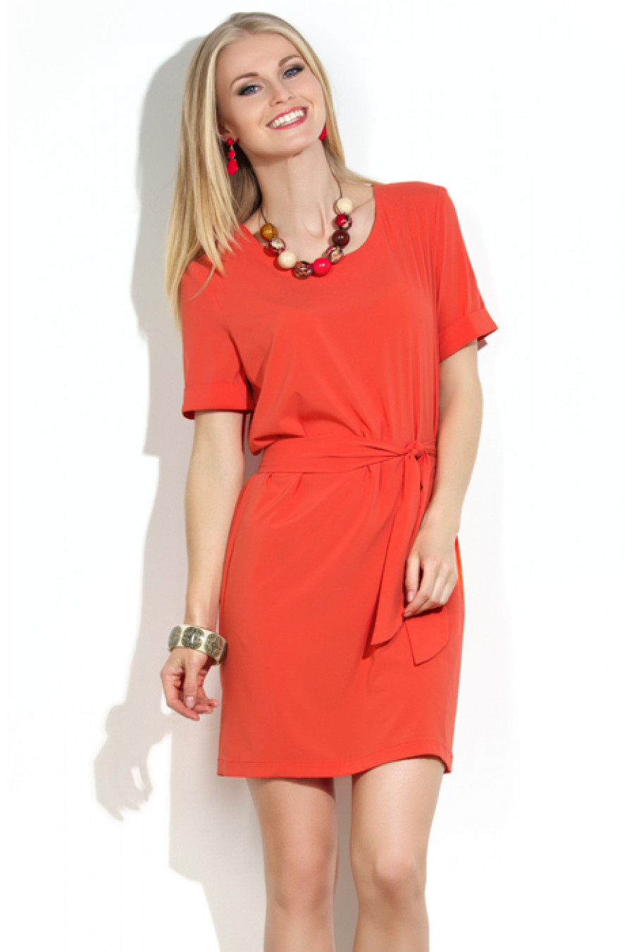 Коктельное платье прямого силуэта из тончайшей ткани, напоминающей натуральный шелк. Вырез горловины круглый, обработан обтачкой. На спинке средний шов. Рукав втачной с отворотом. Платье дополнено поясом из той же ткани, благодаря которому можно менять силуэт платья и из свободной прямой модели делать приталенную. Конструктивно простое платье, выполненное из яркой ткани, несомненно, является трендом сезона. Модель подходит как для повседневной носки, так и для праздничных мероприятий. Длина – 84-87 см (зависит от размера).