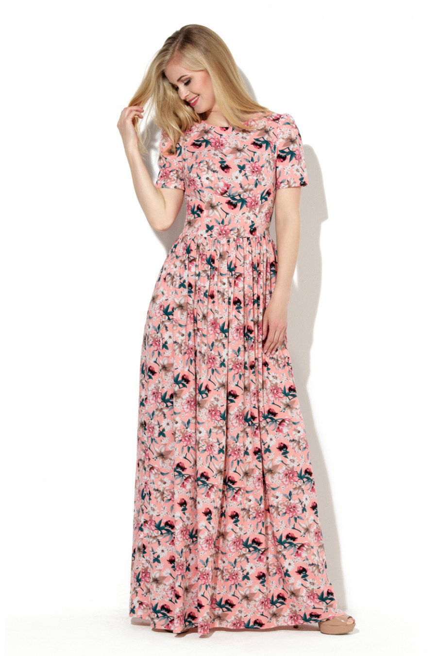 Платье в пол из принтованного штапеля. Платье отрезное по линии талии. Длинная юбка платья имеет сильное расклешение к низу, а так же сборку по линии талии. Благодаря такому крою, платье эффектно струиться при ходьбе. На спинке и полочке, для лучшей посадки изделия по фигуре введены рельефы, в среднем шве спинки потайная молния. Вырез горловины круглый - обработан обтачкой. Рукав короткий - фонарик. Материал, из которого выполнено платье штапель - это ткань, изготавливаемая из хлопка и вискозы. Ткань штапель гигроскопична, тело в такой ткани дышит и дарит ощущение прохлады.
