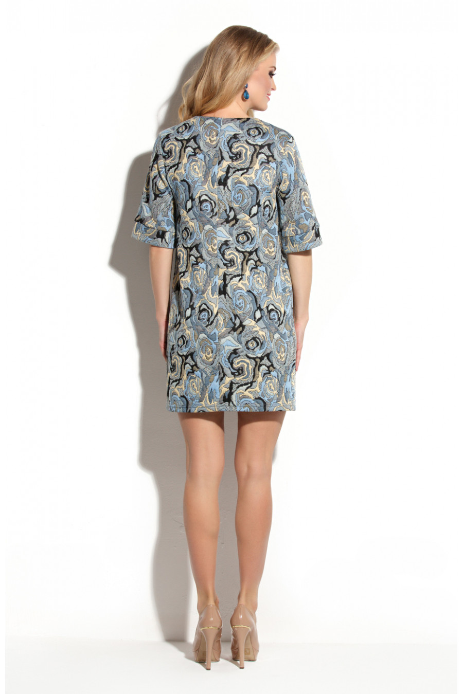 Коктейльное платье прямого силуэта из плотного фактурированного трикотажа с растительным рисунком. Не глубокий круглый вырез горловины обработан обтачкой. Широкий втачной рукав до локтя обработан манжетой. На полочке расположены две длинные диагональные вытачки,направленные из боковых швов. В среднем шве спинки - потайная молния. Конструктивно простое платье, выполненное из ткани напоминающее роскошный габилен, несомненно, является трендом сезона.