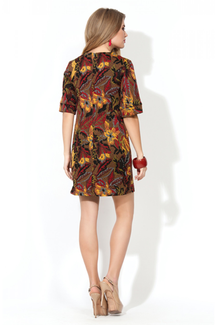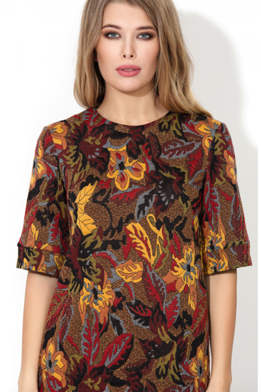 Коктейльное платье прямого силуэта из плотного фактурированного трикотажа с растительным рисунком. Не глубокий круглый вырез горловины обработан обтачкой. Широкий втачной рукав до локтя обработан манжетой. На полочке расположены две длинные диагональные вытачки,направленные из боковых швов. В среднем шве спинки - потайная молния. Конструктивно простое платье, выполненное из ткани напоминающее роскошный габилен, несомненно, является трендом сезона.¶¶Длина – 81-84 см (зависит от размера).¶¶Простота композиция, минимум или вовсе отсутствие декора, в то же время невероятная элегантность и изысканность – это один из акцентов этого сезона. Классика вне времени, актуальны изысканные прямые платья, способные выручить нас в любой ситуации.¶¶Самые популярные коллекции дизайнеров предлагают растительные узоры ярких, броских цветов. Сочные краски поднимут настроение промозглой осенью, а затейливые цветочные мотивы помогут придать образу особый шарм.