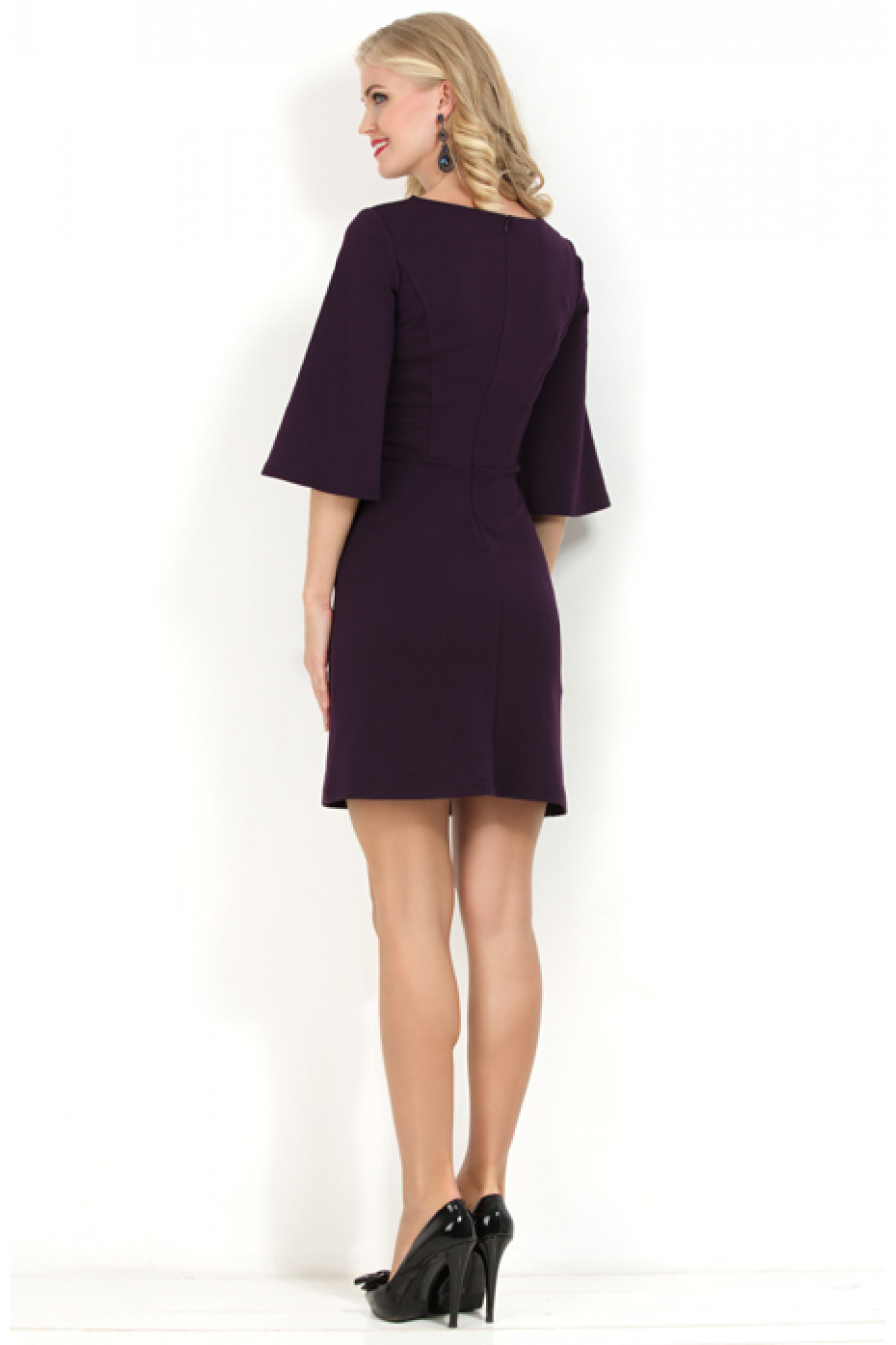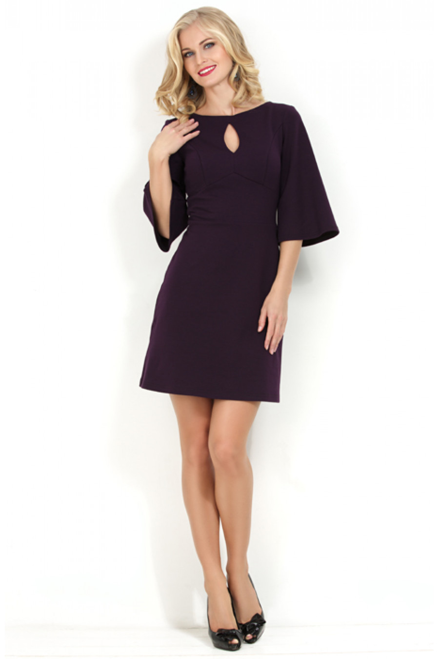 Коктейльное платье из джерси с широким рукавом. Платье отрезное по линии талии. Для отличной посадки в области груди на полочке введены рельефы из проймы. На полочке фигурный подрез под грудью. Декоративным вырезом - капелька подчеркнута область декольте, это придает модели женственности и сексуальности. На спинке средний шов, в котором расположена потайная молния и шлица. Вырез горловины круглый не глубокий. Рукав втачной –силуэта трапеция, длина 3/4. Короткая юбка слегка расширена к низу. Длина : 81-84 см (зависит от размера).
