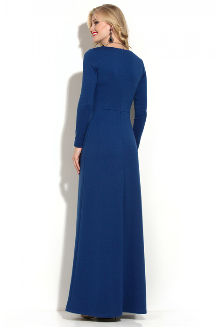 Длинное платье в пол из плотного трикотажа джерси. Платье отрезное по линии талии. На полочке расположены 4 встречные складки, придающие модели эффектности. В среднем шве спинке потайная молния. На спинке рельефы из проймы. Рукав длинный, втачной. Силуэт юбки трапецевидной формы, благодаря ему платье выглядит более элегантно. В таком платье можно пойти как на светский раут, так и просто в кафе с подружками, но несомненно в нем Вы не оставите равнодушным никого. Длина: 147-149 см по спинке(зависит от размера)