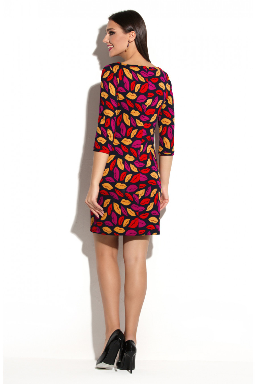 Платье полуприлегающего силуэта. Данная модель выполнена из принтованного трикотажа «диор». На полочке нагрудные вытачки, что обеспечивает отличную посадку платья. Вырез горловины не глубокий - лодочка. Рукав – ¾, втачной. Горловина и низ рукава обработаны планкой. Конструктивно простое платье, выполненное из яркой принтованной ткани, несомненно, является трендом сезона.