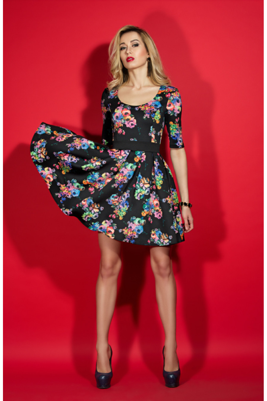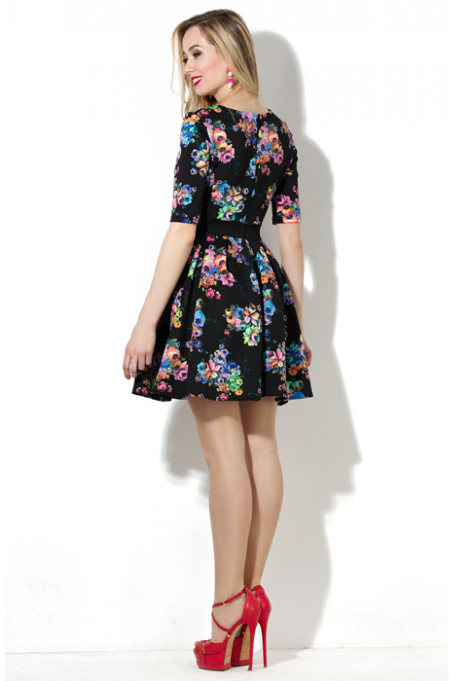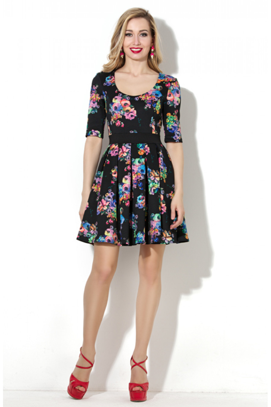 Коктейльное платье с пышной юбкой из плотного принтованного трикотажа «водолаз». Платье отрезное по линии талии с поясом контрастного цвета. Для лучшей посадки изделия по фигуре на полочке и спинке платья введены рельефы. Глубокий круглый вырез горловины придает модели женственность и изящность. Рукав втачной длиной до локтя. В среднем шве спинки застежка на потайную молнию. Пышный силуэт юбки, достигнут благодаря глубоким складкам. Длина – 77-79 см (зависит от размера).