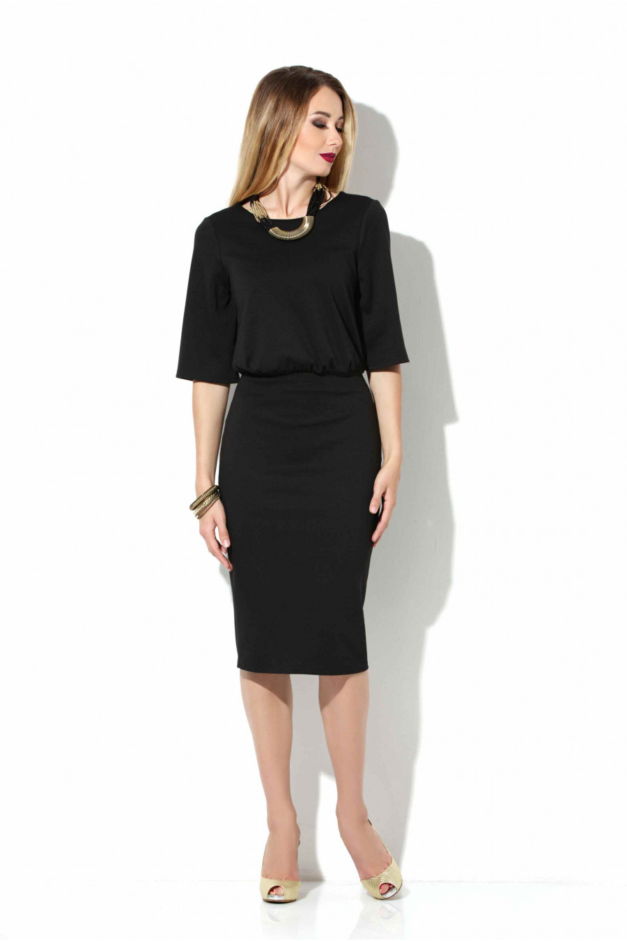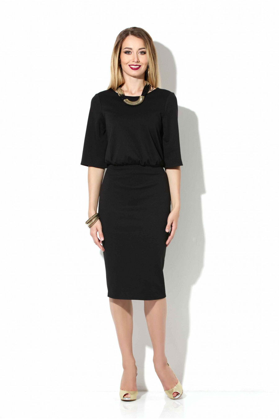 Элегантное платье с объемным верхом из плотного трикотажа «джерси». Платье отрезное по линии талии, с драпировками на полочке и спинке. В шов на линии талии вшита резинка, благодаря которой платье хорошо фиксируется. Лиф платья образует небольшой навал, что позволяет посадить платье на любую фигуру. Юбка формы «карандаш». Рукав до линии локтя слегка расширен к низу. В среднем шве спинки застежка на потайную молнию и шлица. Вырез горловины – «лодочка». Длина – 103-105 см (зависит от размера).