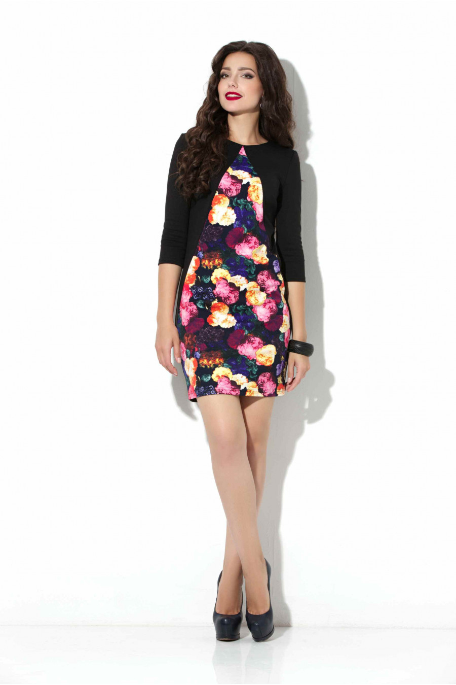 Платье из мягкого трикотажа «лакоста» прямого силуэт. Вырез горловины круглый неглубокий. Рукав 3/4 узкий втачной. На полочке нагрудные вытачки и декоративная вставка контрастного цвета. В среднем шве спинки – потайная молния. Силуэт платья позволяет носить данную модель девушкам разного телосложения. Длина – 83-85 см (зависит от размера).
