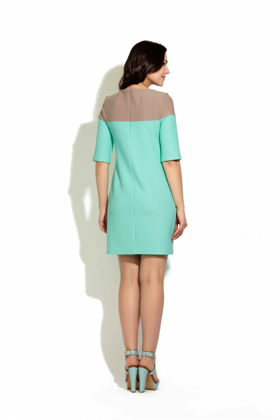 Коктейльное платье из плотного трикотажа «диор с». Используемый материал по фактуре очень напоминает плотную костюмную ткань. Платье прямого силуэт. Вырез горловины круглый неглубокий. Рукав до линии локтя узкий втачной. На полочке нагрудные вытачки. В среднем шве спинки – потайная молния. Верхняя часть данной модели выполнена из того же материала контрастного цвета. Силуэт платья позволяет носить данную модель девушкам разного телосложения.
