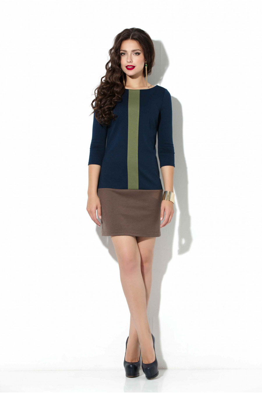 Платье прямого силуэта из трех цветов плотного трикотажа «джерси». Силуэт платья решен за счет боковых швов. На полочке платья введена декоративная планка контрастного цвета. Платье отрезное по линии бедер. Нижняя часть платья выполнена из ткани третьего цвета. В среднем шве спинки застежка на потайную молнию. Рукав втачной узкий длиной ?. Вырез горловины не глубокий – «лодочка». Длина – 81-83 см (зависит от размера).