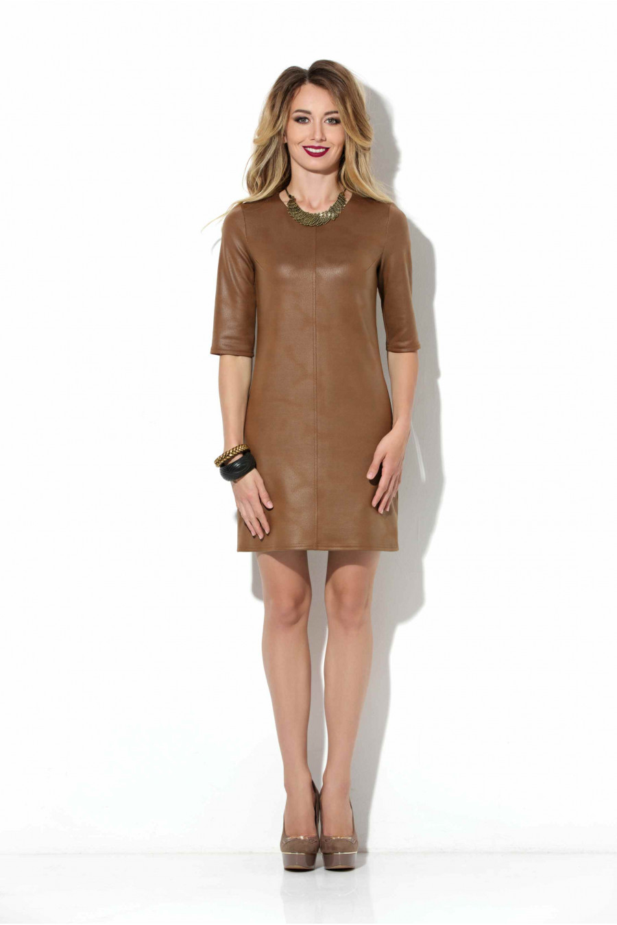 Платье мини полуприлегающего силуэта выполнено из искусственной кожи. Силуэт платья достигнут за счет боковых швов. На спинке в среднем шве открытая металлическая молния, которая также служит декоративной отделкой. Рукав узкий до локтя. Вырез горловины круглый не глубокий. Фактура ткани – эффект потрескавшейся кожи, придает модели брутальности и актуальности в этом сезоне. Длина – 81-83 см (зависит от размера).