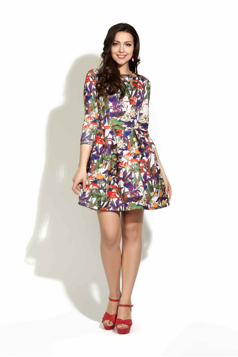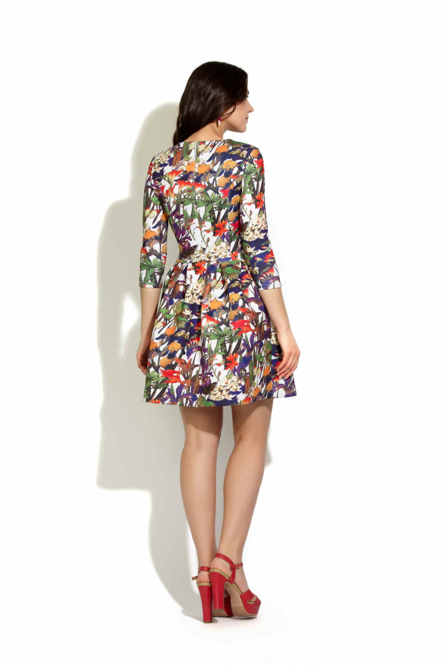 Коктейльное платье отрезное по линии талии. Платье выполнено из плотного трикотажа – «неопрен» с роскошным растительным рисунком. Отличная посадка лифа достигнута благодаря рельефам на спинке и полочке. Платье отрезное по линии талии. Юбка платья с неглубокими складками образует форму «колокольчик». Вырез горловины круглый неглубокий. Рукав втачной до локтя. В среднем шве спинки застежка на потайную молнию. Силуэт платья придает женской фигуре изящности, визуально делая ее стройнее.