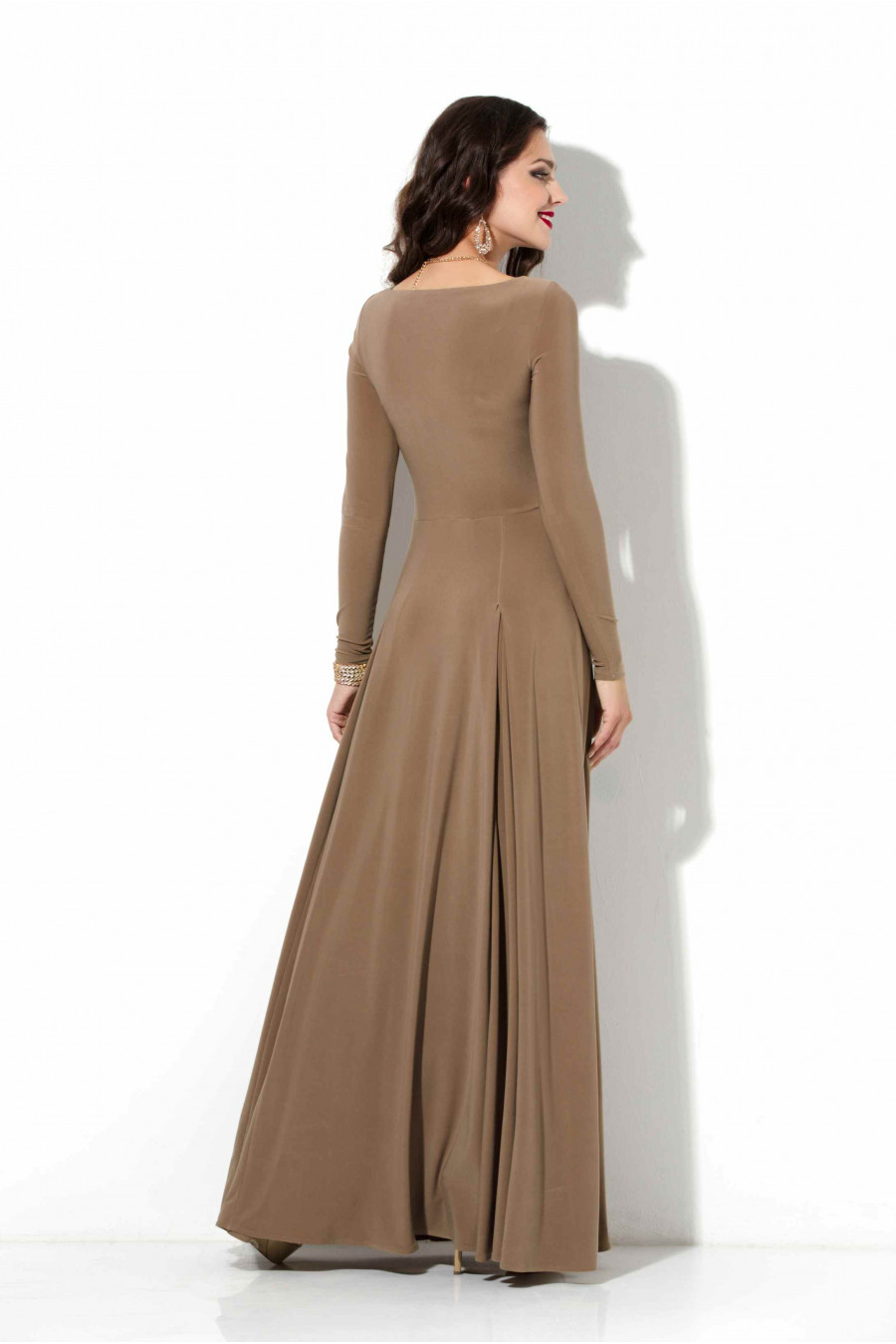 Эффектное платье длиной в пол из тонкого мягкого трикотажа «масло». Платье отрезное по линии талии. Лиф платья выполнен из двойного слоя трикотажа, что скрывает пролегание нижнего белья. Юбка представляет собой шестиклинную основу, клинья которой сильно расклешены к низу, а между клиньев на полочке и спинке вшиты конусные вставки, что дополнительно увеличивает ширину юбки по низу. Рукав втачной длинный. Вырез горловины – не глубокий «лодочка», что придает модели женственности и сексуальности. Длина – 105-107 см (зависит от размера).