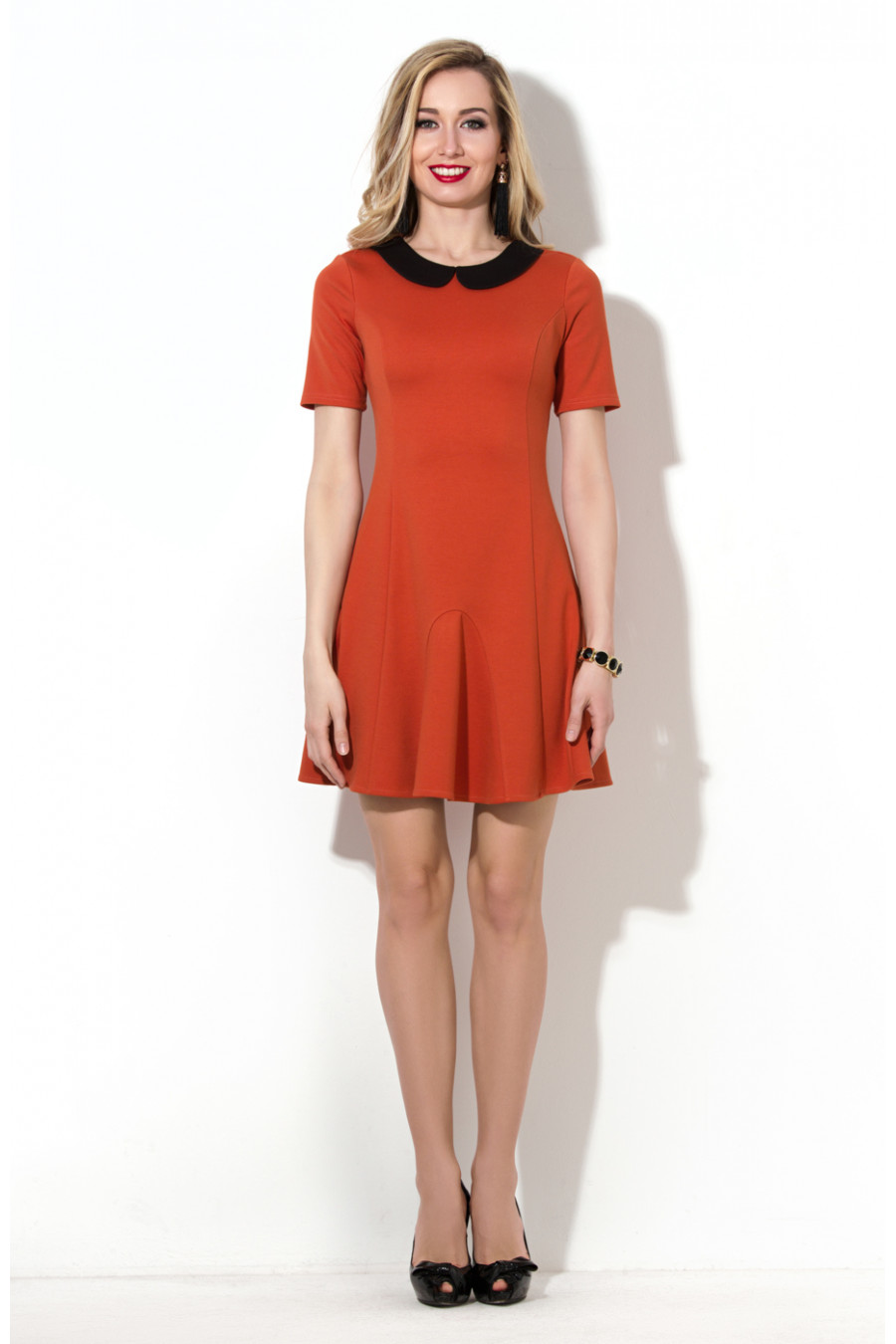 Оригинальное платье с расклешенной юбкой из трикотажа «джерси». Силуэт платья, достигнут благодаря рельефам на полочке и спинке, фигурным клиньям и боковым швам. Благодаря такому крою достигнуто прилегание в области талии и объем в нижней части платья. В среднем шве спинки застежка на потайную молнию. Рукав втачной короткий. Вырез горловины круглый с отложным декоративным воротником из ткани контрастного цвета.