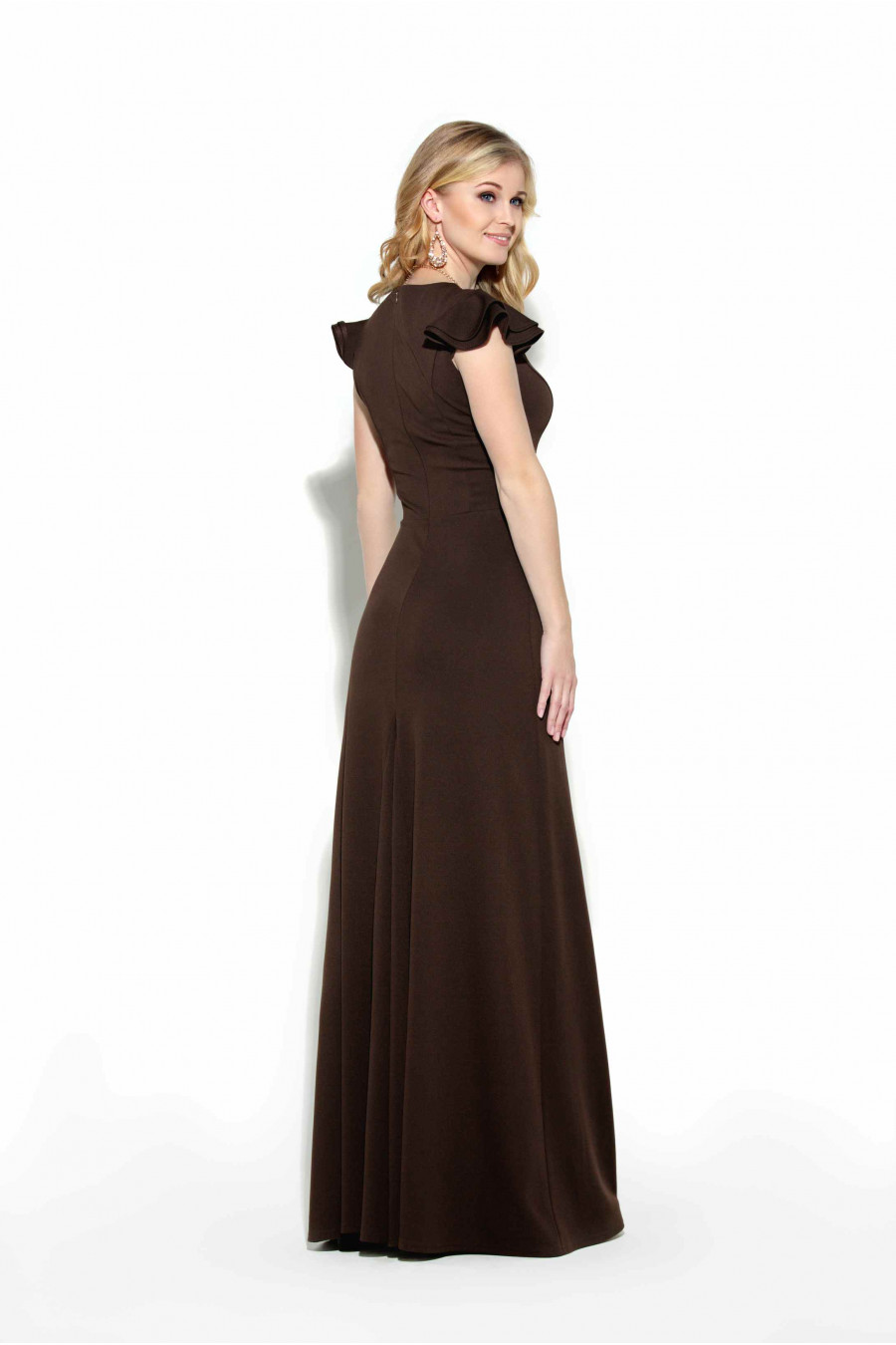 Вечернее платье длиной в пол. Данная модель выполнена из плотной трикотажной ткани «диор». Платье отрезное по линии талии. На лифе платья введены рельефы. Юбка слегка расширена к низу, образует трапециевидный силуэт. Сзади в средний шов юбке вшит расклешенный клин. Двойные воланы вместо рукавов напоминают крылышки, этот элемент придает модели женственности и романтизма. Вырез горловины – не глубокий круглый.