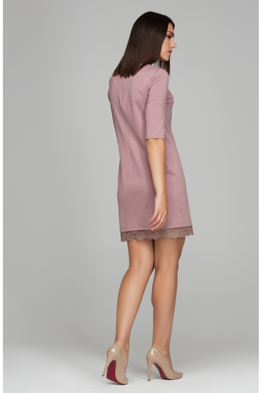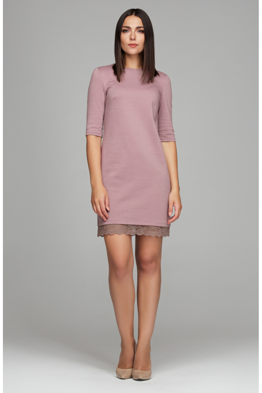 Коктейльное платье полуприлегающего силуэта. Данная модель выполнена из плотного трикотажа «джерси». На полочке введены нагрудные вытачки, на спинке – средний шов и застежка на потайную молнию. Рукав втачной 3/4. Декоративным элементом служит нежное кружево, которое выглядывает из-под платья.