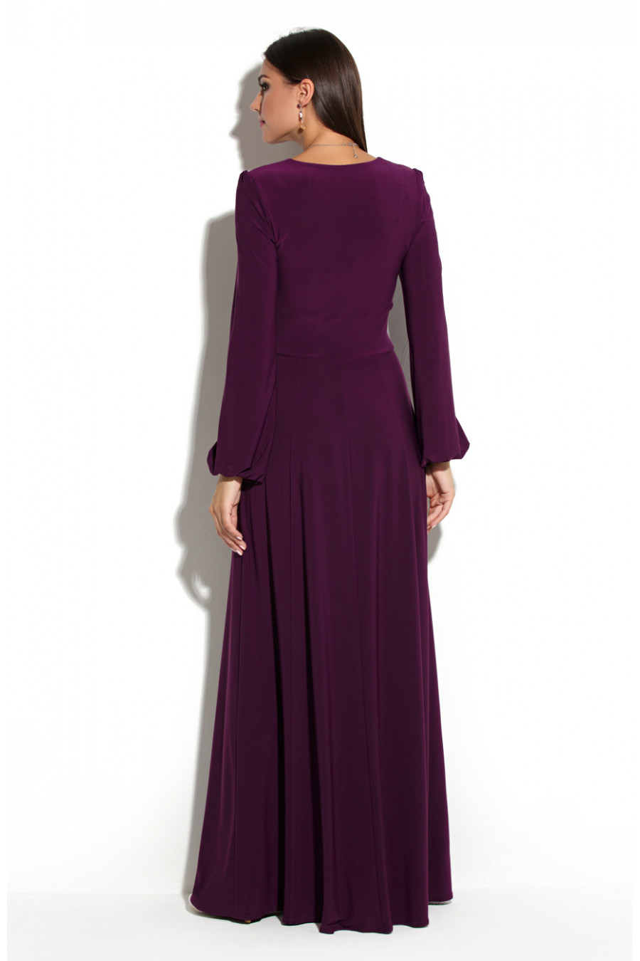 Вечернее платье из тонкого струящегося трикотажа. В области талии расположен широкий подрезной пояс, который подчеркивает грудь и талию, визуально удлиняя фигуру. Лиф платья слегка присборен под грудью. На полочке глубокий вырез, подчеркивающий область декольте. Рукав втачной расширен к низу и присборен на манжет. Юбка платья выполнена из трапециевидных клиньев.