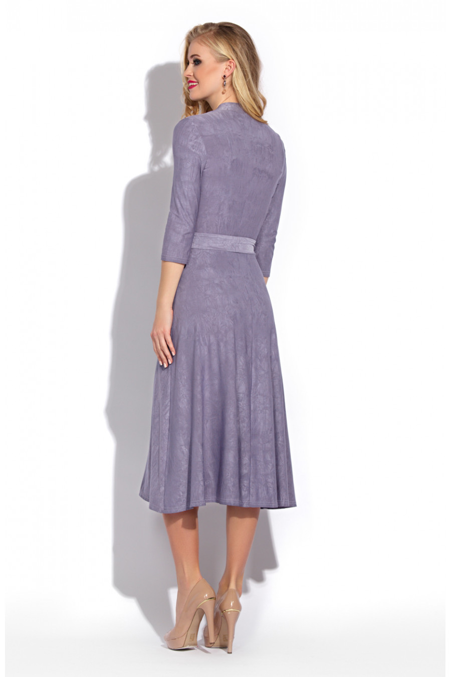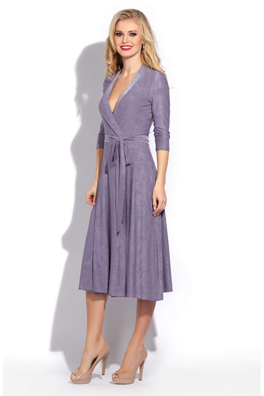 Романтичное платье из тонкого струящегося трикотажа с жатым эффектом. Платье отрезное по линии талии. Лиф платья выполнен назапах, благодаря чему образуется глубокий V-образный вырез декольте. Срезы платья по бортам обработаны узкой планкой. Рукав длиной 3/4 втачной. Юбка платья сильно расклешена. Дополняет платье длинный узкий пояс.