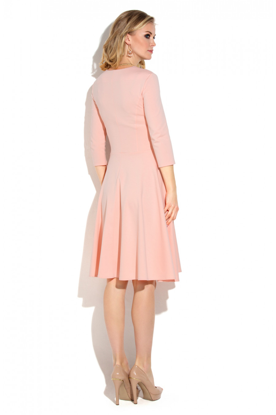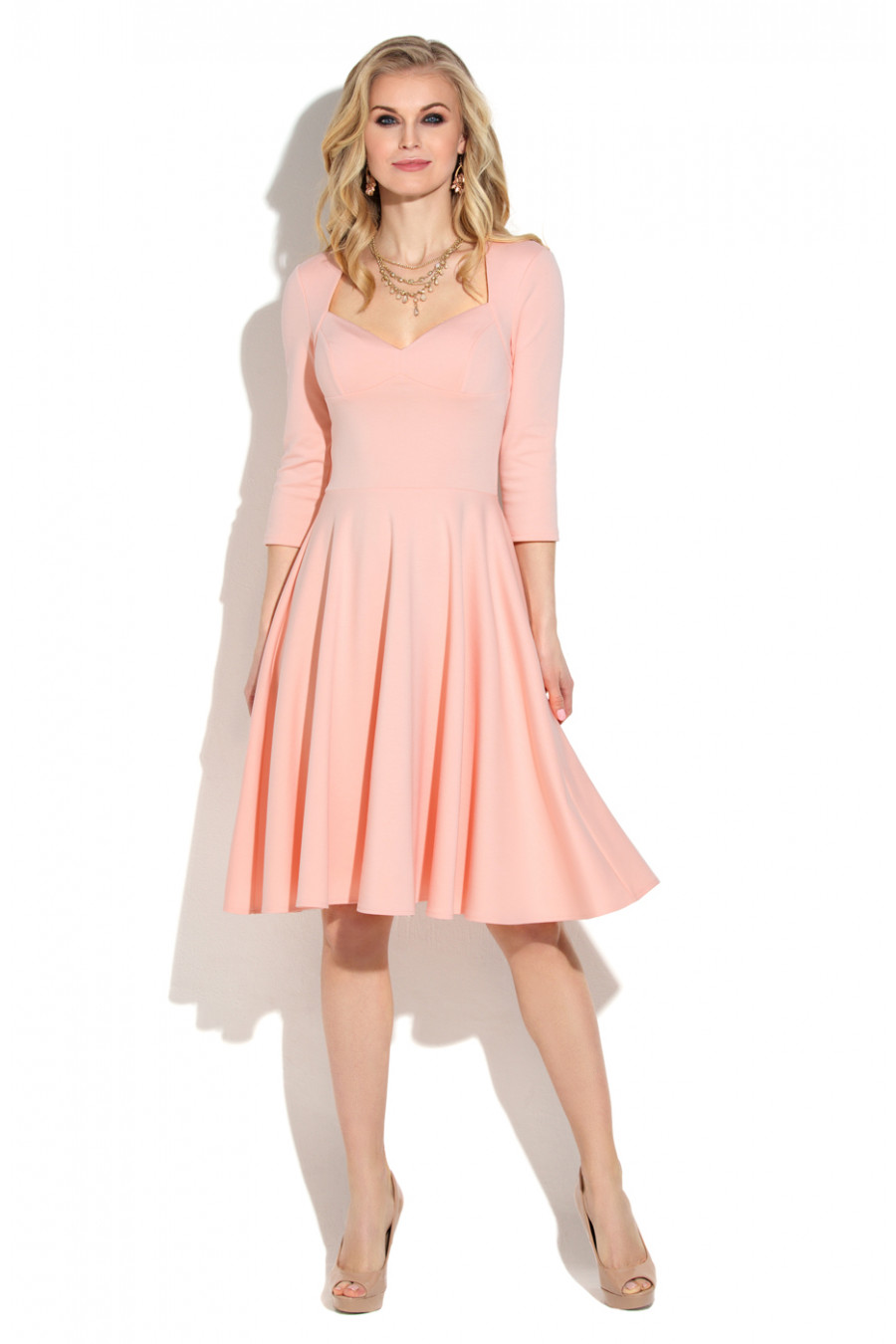 Коктейльное платье отрезное по линии талии. Силуэт лифа, достигнут благодаря рельефам на полочке и спинке. Вырез горловины глубокий сердцеобразный, подходит почти для всех типов фигур, так как визуально увеличивает грудь и удлиняет шею. Лиф платья с чашечками выполнен из двойного слоя трикотажа, благодаря такой обработке все внутренние швы скрыты. Рукав втачной 3/4. На спинке в среднем шве застежка на потайную молнию. Юбка платья имеет форму полусолнце, что придает модели еще более романтичный образ. Силуэт платья придает женской фигуре изящности, визуально делая ее стройнее.