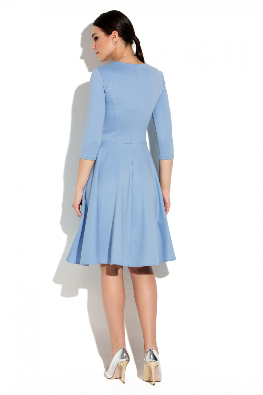Коктейльное платье отрезное по линии талии. Силуэт лифа, достигнут благодаря рельефам на полочке и спинке. Вырез горловины глубокий сердцеобразный, подходит почти для всех типов фигур, так как визуально увеличивает грудь и удлиняет шею. Лиф платья с чашечками выполнен из двойного слоя трикотажа, благодаря такой обработке все внутренние швы скрыты. Рукав втачной 3/4. На спинке в среднем шве застежка на потайную молнию. Юбка платья имеет форму полусолнце, что придает модели еще более романтичный образ. Силуэт платья придает женской фигуре изящности, визуально делая ее стройнее.