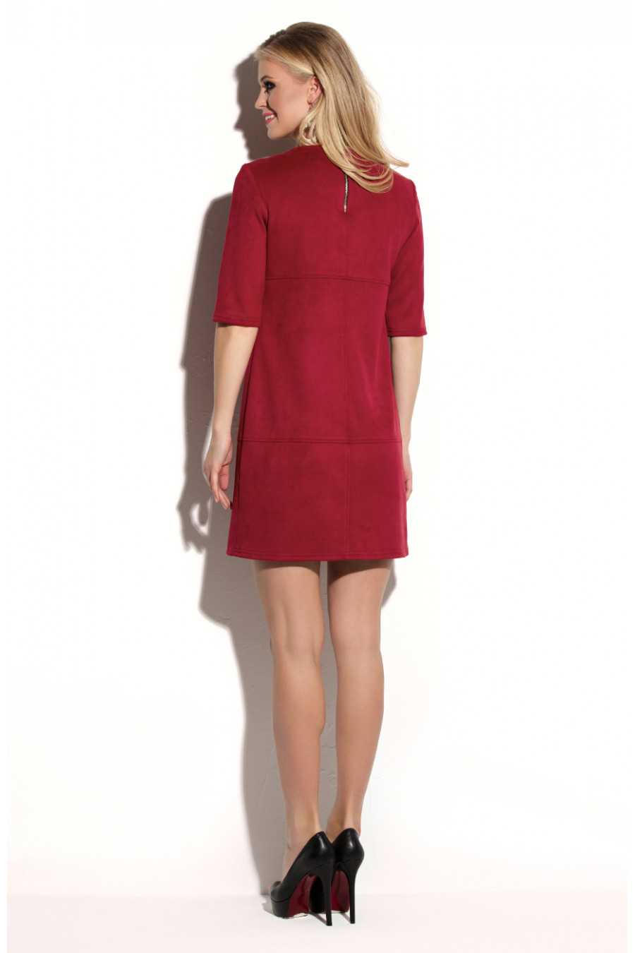 Мини платье полуприлегающего силуэта выполнено из искусственной замши. Силуэт платья достигнут за счет боковых швов и рельефов на полочке. В среднем шве спинке открытая металлическая молния, которая также служит декоративной отделкой. Рукав узкий до локтя. Вырез горловины круглый не глубокий. На спинке и полочке расположены декоративные горизонтальные подрезы, для большей выразительности вдоль швов проходит отстрочка. Фактура ткани – «под замшу», придает модели брутальности и актуальности в этом сезоне.