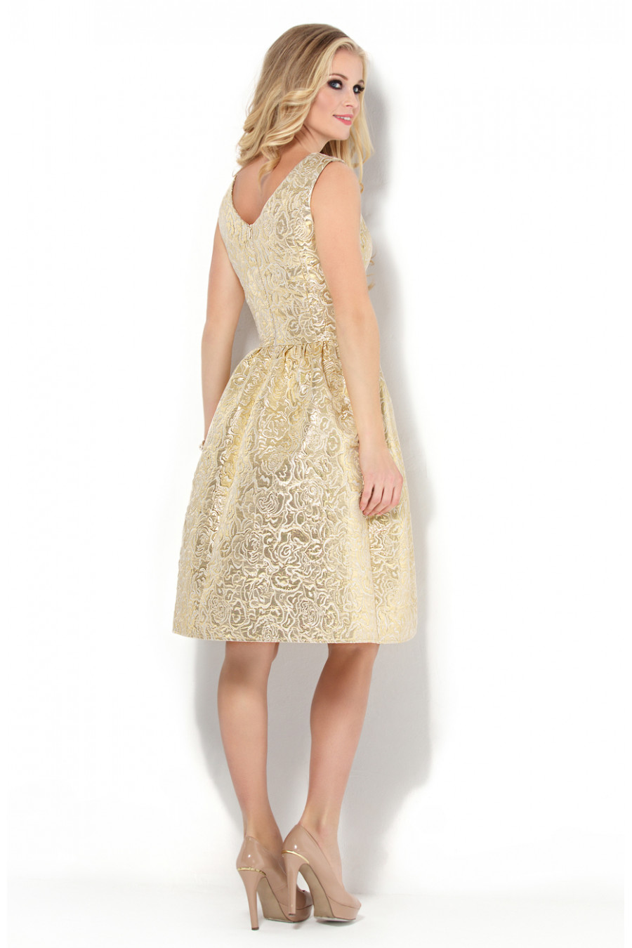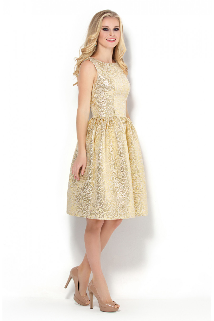 Коктейльное платье отрезное по линии талии. Платье выполнено из жаккардовой ткани цветочным рисунком. Отличная посадка лифа достигнута благодаря рельефам на спинке и полочке. Платье отрезное по линии талии. Юбка платья в мелкую густую сборку образует форму «колокольчик». Вырез горловины спереди – элегантная лодочка, на спинке V-образный вырез неглубокий. В среднем шве спинки застежка на потайную молнию. Силуэт платья придает женской фигуре изящности, визуально делая ее стройнее.