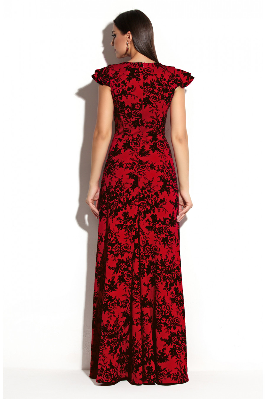 Вечернее платье длиной в пол. Данная модель выполнена из плотной трикотажной ткани «диор». Платье отрезное по линии талии. На лифе платья введены рельефы. Юбка слегка расширена к низу, образует трапециевидный силуэт. Сзади в средний шов юбке вшит расклешенный клин. Двойные воланы вместо рукавов напоминают крылышки, этот элемент придает модели женственности и романтизма. Вырез горловины – не глубокий круглый.