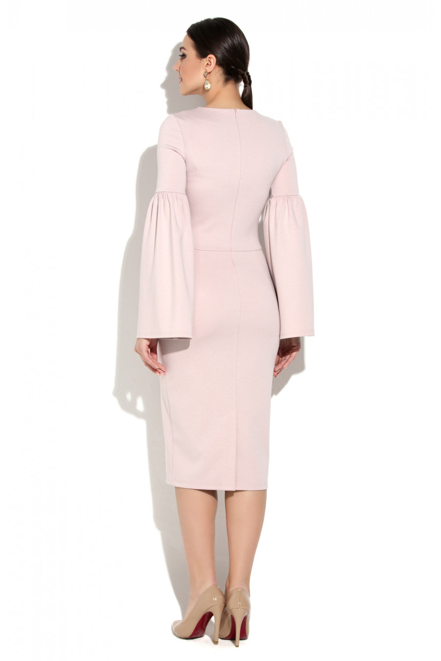 Платье футляр отрезное по линии талии. Силуэт лифа, достигнут благодаря косым нагрудным вытачкам. Вырез горловины круглый не глубокий. Рукав втачной, широкий внизу, над линией локтя рукав имеет подрез и сильно присборен. На спинке в среднем шве застежка на потайную молнию и шлица. Силуэт платья придает женской фигуре изящности, визуально делая ее стройнее.