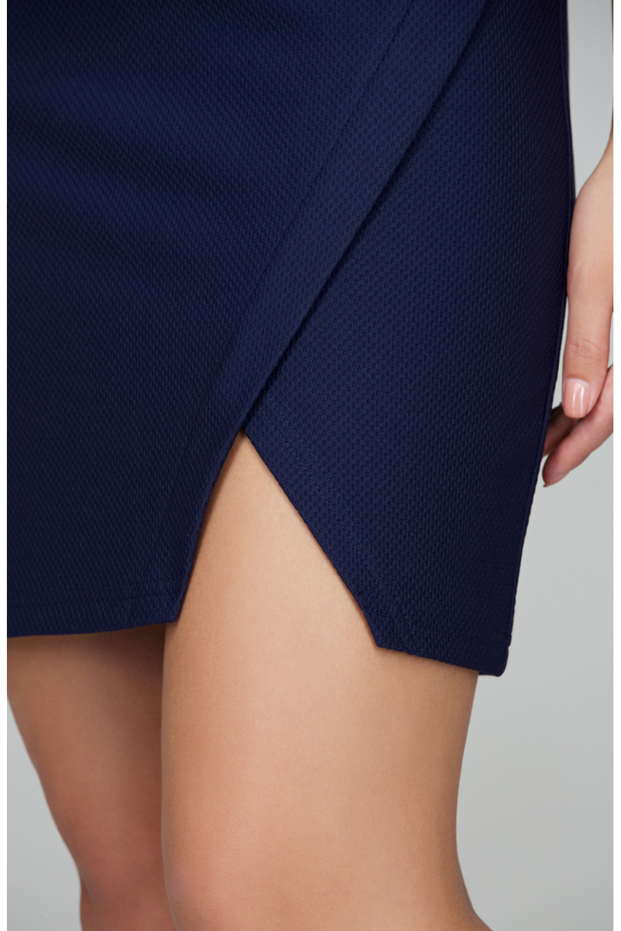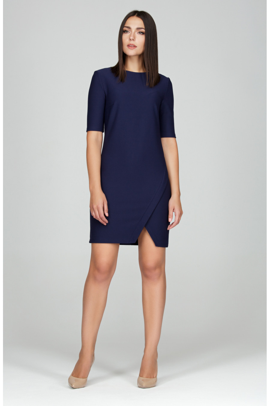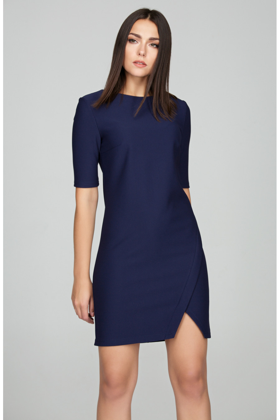 Коктейльное платье из плотного трикотажа «диор с». Платье слегка приталенного силуэт. Вырез горловины круглый неглубокий. Рукав до линии локтя узкий втачной. На полочке нагрудные вытачки. В среднем шве спинки – потайная молния. Полочка имеет ассиметричный крой, это придает модели оригинальность и модную актуальность. Силуэт платья позволяет носить данную модель девушкам разного телосложения.