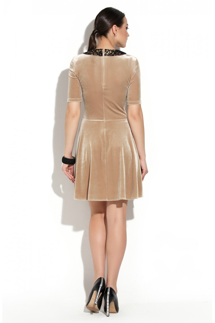 Коктейльное платье с расклешенной юбкой и воротничком из кружева. Данная модель выполнена из модного в этом сезоне материала «бархат». Идеальная посадка лифа достигнута за счет вытачек на полочке. Платье отрезное по линии талии. Юбка платья имеет форму «полусолнце». Рукав втачной короткий.