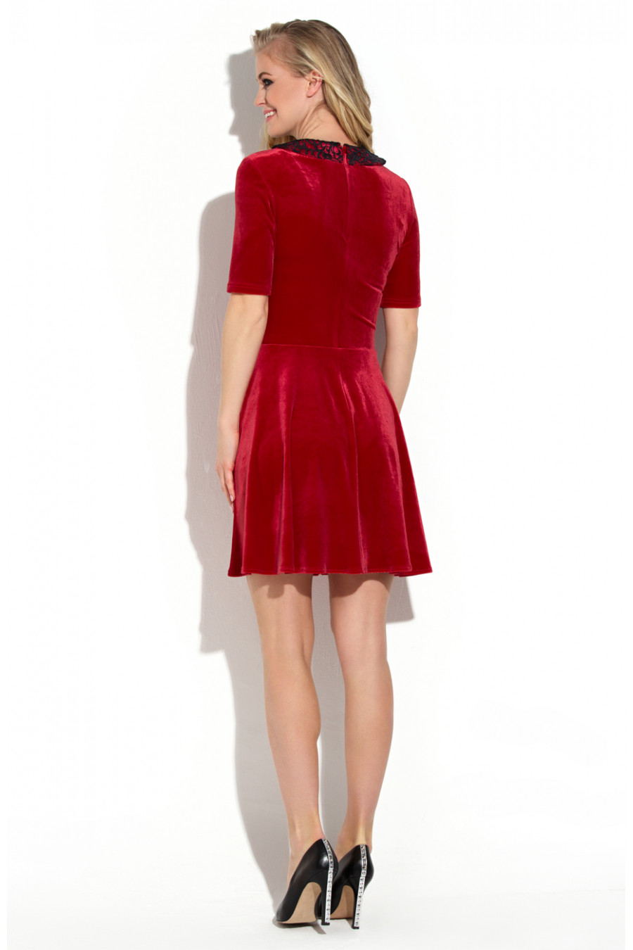 Коктейльное платье с расклешенной юбкой и воротничком из кружева. Данная модель выполнена из модного в этом сезоне материала «бархат». Идеальная посадка лифа достигнута за счет вытачек на полочке. Платье отрезное по линии талии. Юбка платья имеет форму «полусолнце». Рукав втачной короткий.