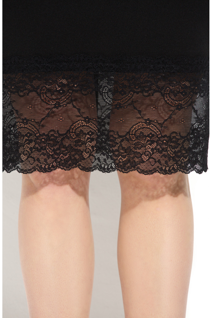 Элегантное платье футляр прилегающего силуэта выполнено из эластичного крепа. Платье отрезное по линии талии с рельефами на лифе. Спинка со средним швом, с застежкой на потайную молнию и шлицей в нем. Вырез горловины V-образный глубокий. Плечо платья слегка прикрыто коротким рукавчиком. По низу платья пришито нежное широкое кружево.