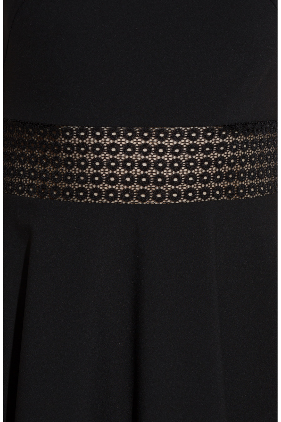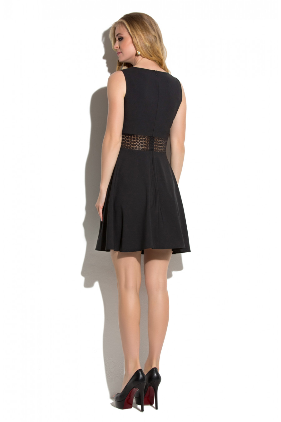 Коктейльное платье из легкой плательной ткани. По линии талии вшит широкий декоративный кружевной пояс. На полочке введены косые нагрудные вытачки, в среднем шве спинки – застежка на потайную молнию. Вырез горловины «лодочка». Юбка сильно расклешена.