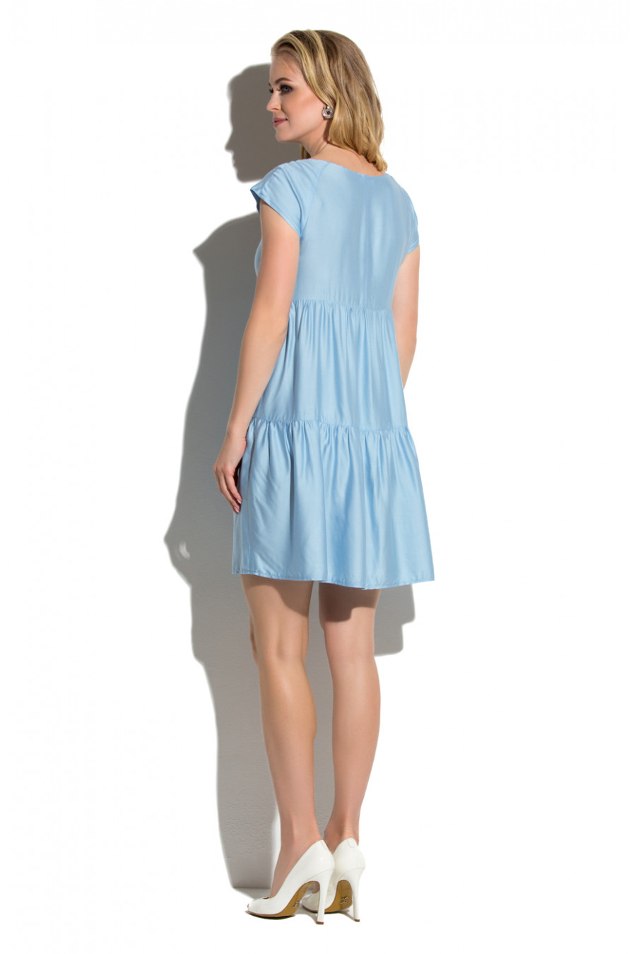 Коктейльное платье расклешенного силуэта с воланами. Платье отрезное под грудью. Для обеспечения идеальной посадки по фигуре на полочке введены нагрудные вытачки. Нижняя часть платья представляет собой два густо присборенных волана, что придает платью сильное расклешение. Рукав короткий – реглан. Вырез горловины круглый глубокий. Такая модель платья подойдет обладательницам любых фигур, оно удачно скрывает недостатки и подчеркивает достоинства.