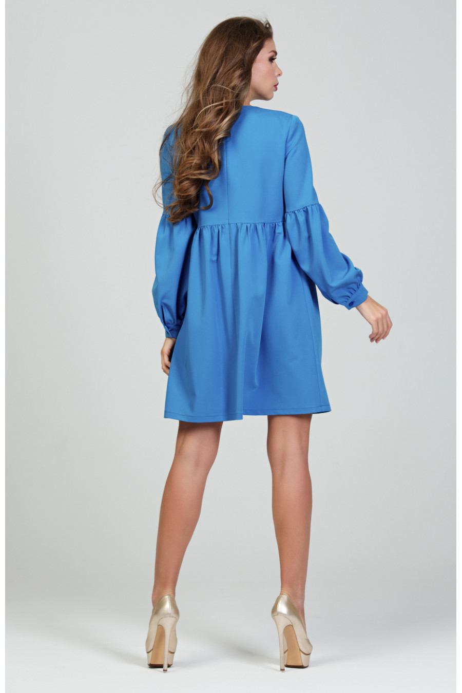 Коктейльное платье из плательной ткани «гальяно». Платье широкого кроя, имеет подрез выше линии талии и юбку на сборке. Вырез горловины не глубокий круглый Рукав втачной, отрезной выше линии локтя и присборен, низ рукава так же присборен на манжет. В среднем шве спинке застежка на потайную молнию.